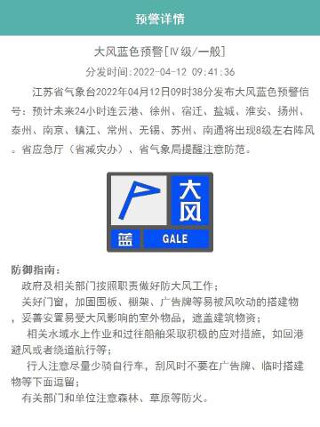 江苏省气象台2022年04月12日09时38分发布大风蓝色预警信号:预计未来24小时连云港、徐州、宿迁、盐城、淮安、扬州、泰州、南京、镇江、常州、无锡、苏州、南通将出现8级左右阵风。省应急厅(省减灾办)、省气象局提醒注意防范!