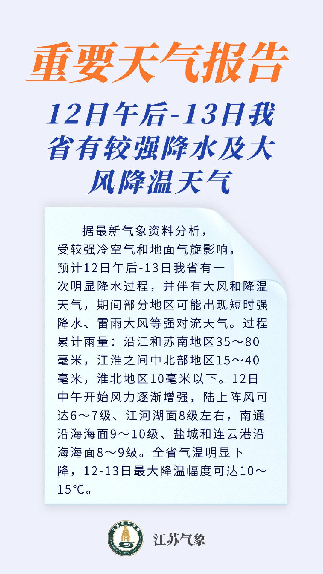 江苏发布大风蓝色预警!8级大风将自北向南影响全省
