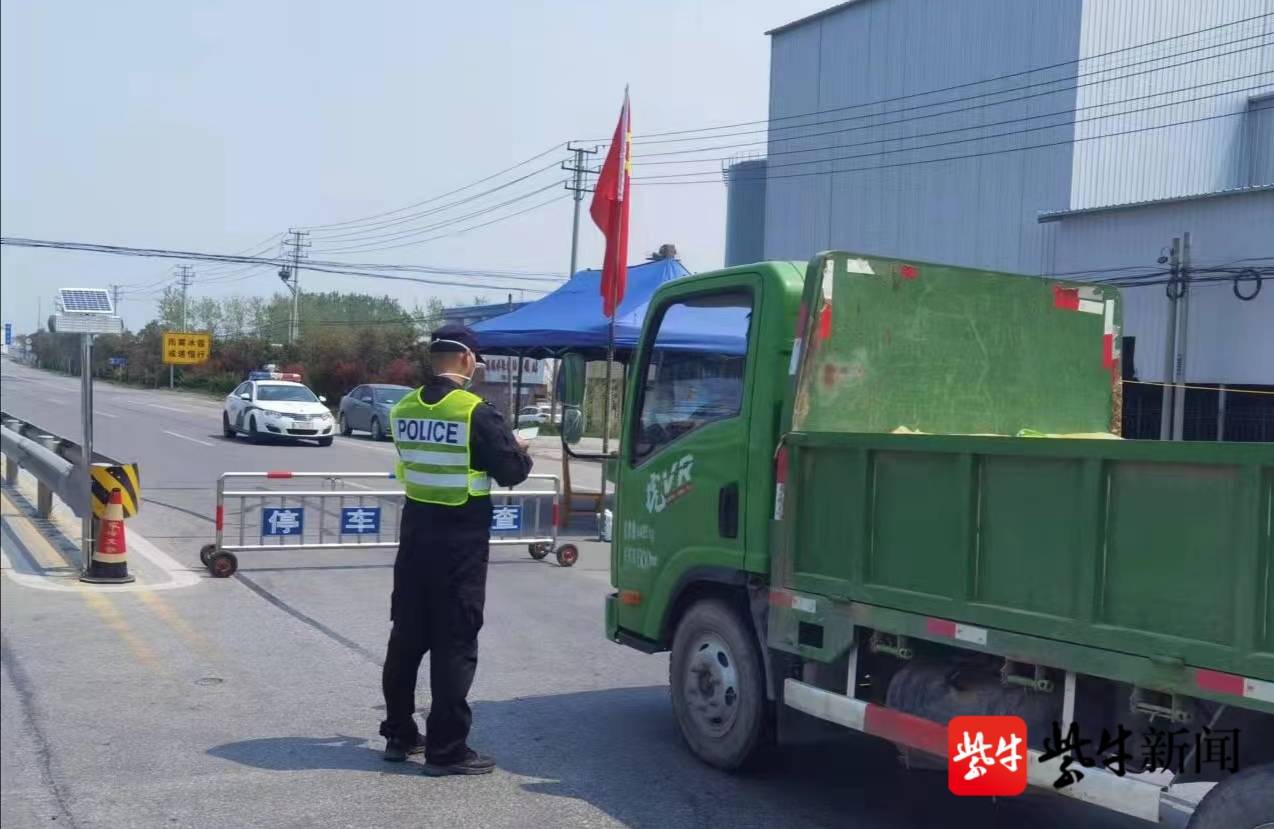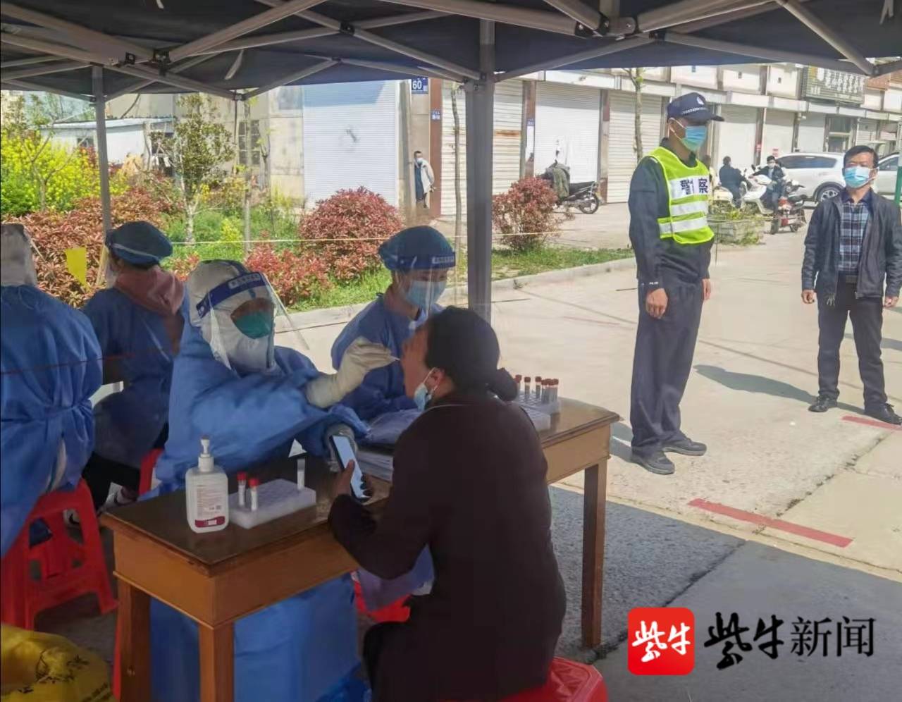 4月21日上午,在射阳县千秋镇核酸检测点,民警蔡正让遇到前来采集核酸的妻子茅晶晶,幽默而亲切地打着招呼。