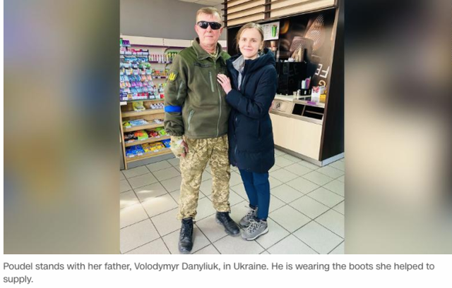 据美国有线电视新闻网 (CNN)报道,一名乌克兰裔美国人正在帮助向乌克兰士兵运送物资。特提亚娜·普德尔(Tetiana Poudel)的父亲是乌克兰领土防卫部队的一名副指挥官,他需要战斗靴。
