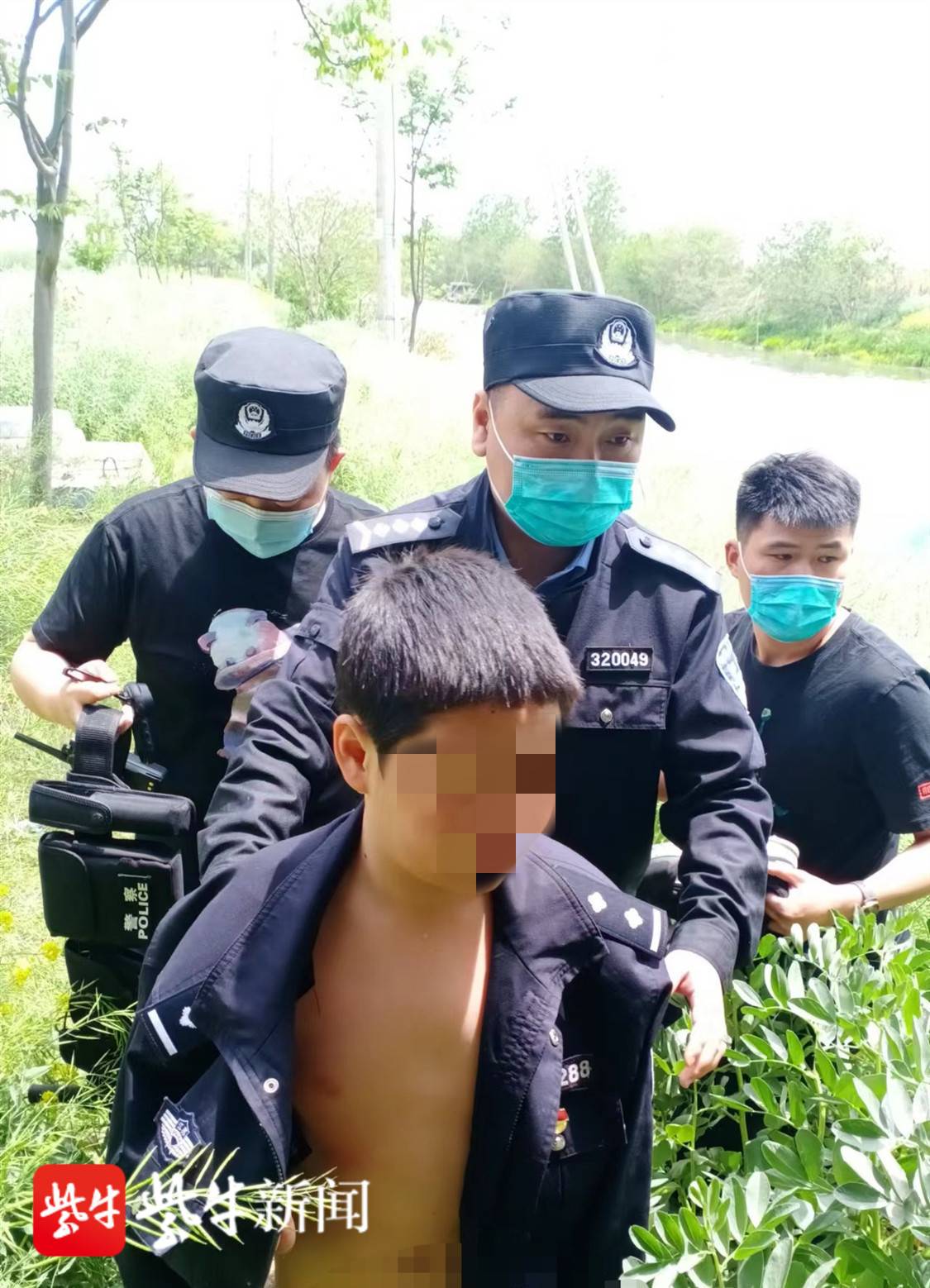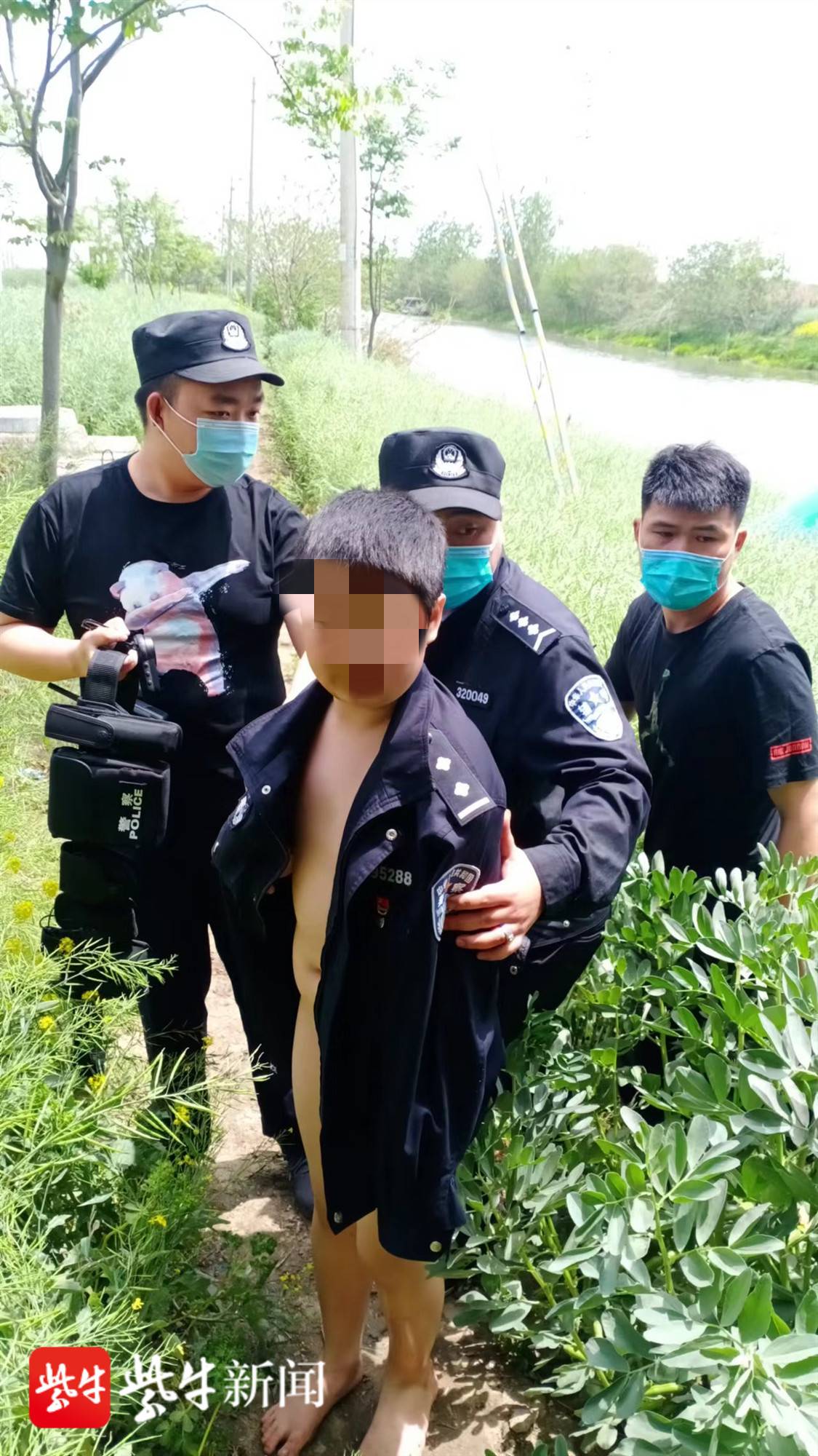 4月27日中午12时许,阜宁县施庄派出所民警在阜宁县阜城街道渔深河中岗村地段巡逻时,发现有一小男童光着身子站在河水中,民警随即跳入河中将男孩救助上岸 ,脱下警服给男孩披上取暖。