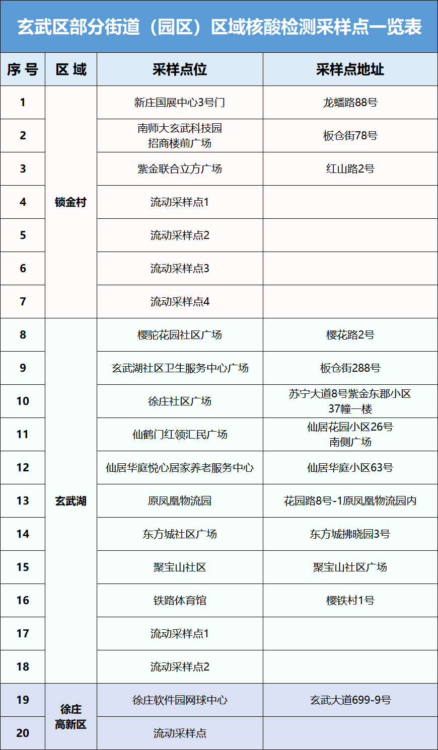 附表:锁金村街道、玄武湖街道和徐庄高新区核酸检测采样点一览表