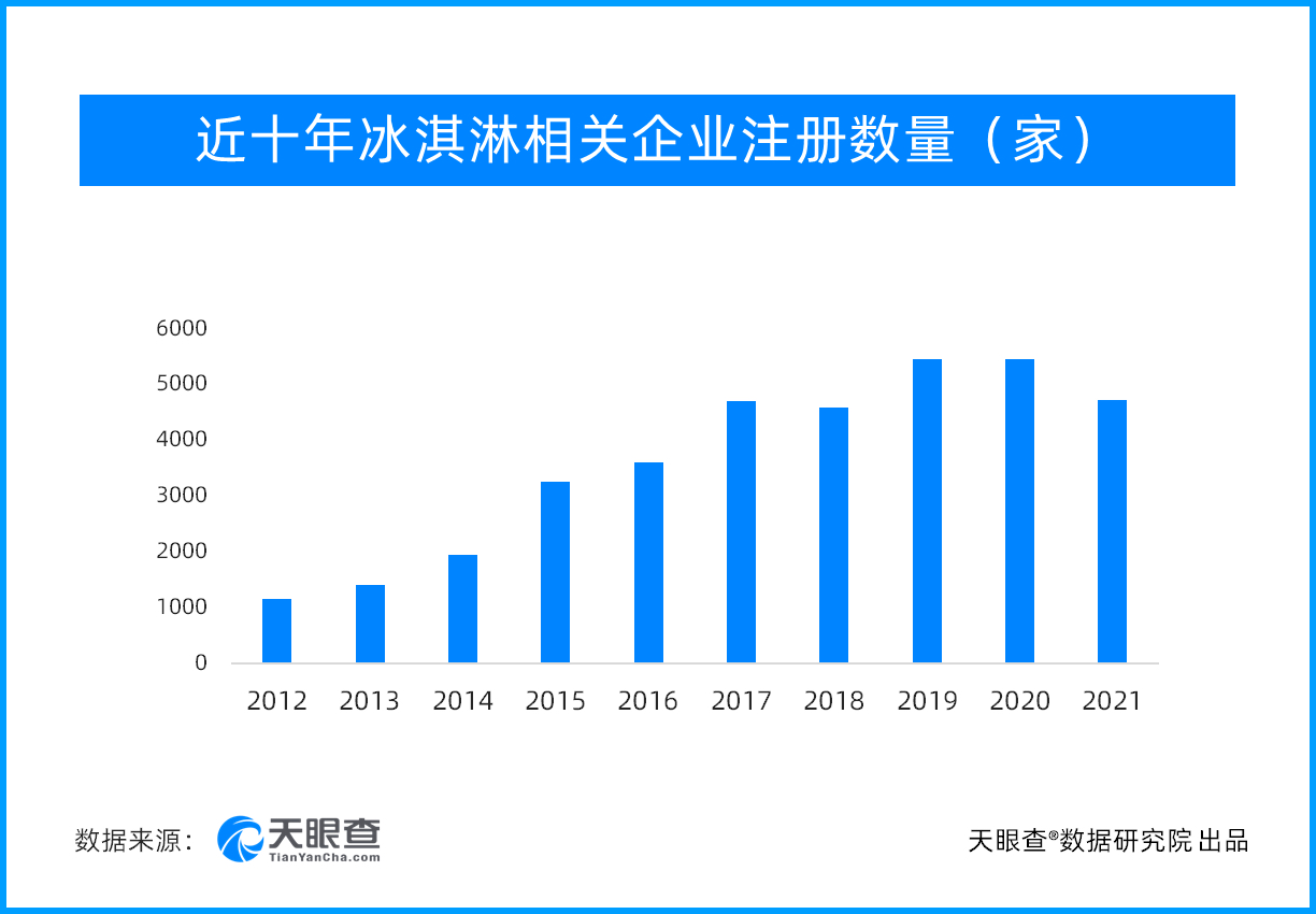 天眼查数据显示,截至目前,我国拥有冰淇淋相关企业4.5万家,其中2021年,新增注册企业4720余家,注册增速达12.5%;