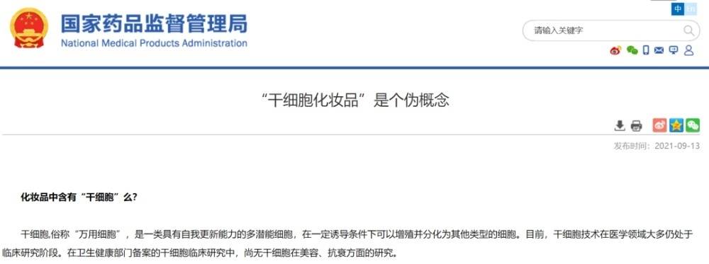 此前,国家药监局也曾发文提醒,“干细胞化妆品”是个伪概念,目前干细胞技术在医学领域大多仍处于临床研究阶段,在卫生健康部门备案的干细胞临床研究中,尚无干细胞在美容、抗衰方面的研究。