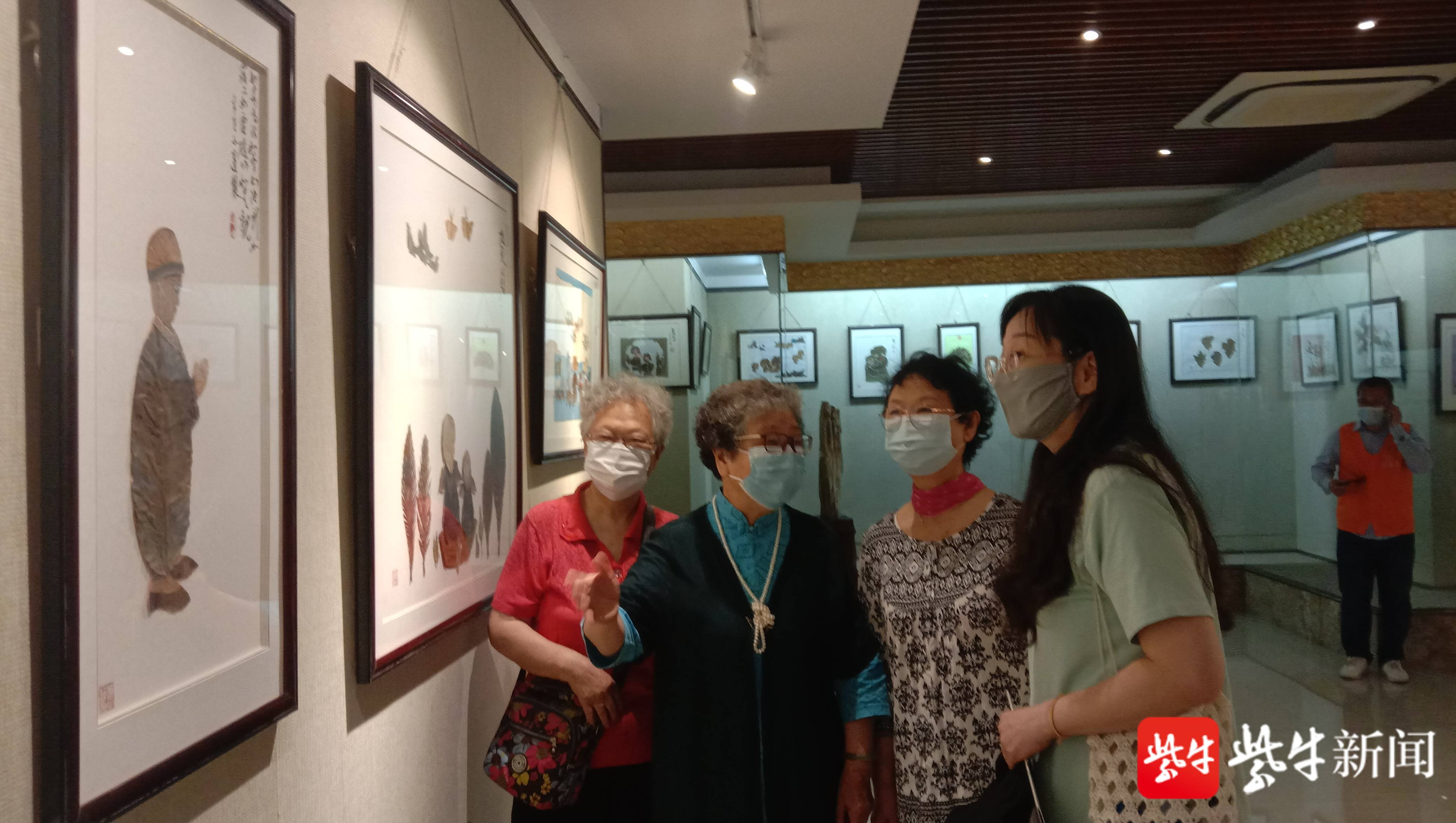 南京玄武居民吴正莲在鸡鸣寺书画院展出树叶造型画