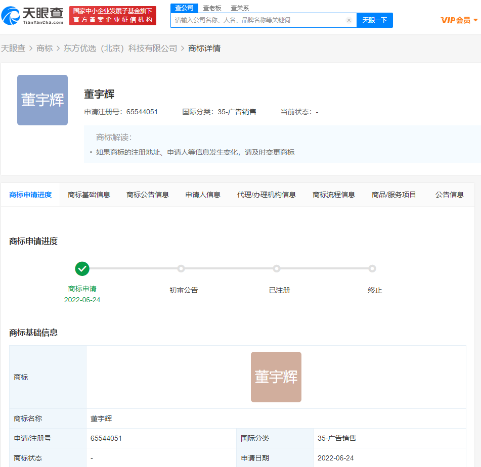 这与此前新东方董宇辉被抢注商标不无关系。6月29日,国家知识产权局商标局官网显示,“董宇辉”商标近日被上海博润腾实业有限公司、自然人楚克坤申请注册,国际分类包括咖啡、茶、米面、巧克力、糕点甜食等,查询商标详情显示:此商标正等待受理,暂无法查询详细信息。董宇辉为新东方旗下东方甄选主播,近期因知识式带货“爆红”。目前东方甄选直播间粉丝已超2000万。