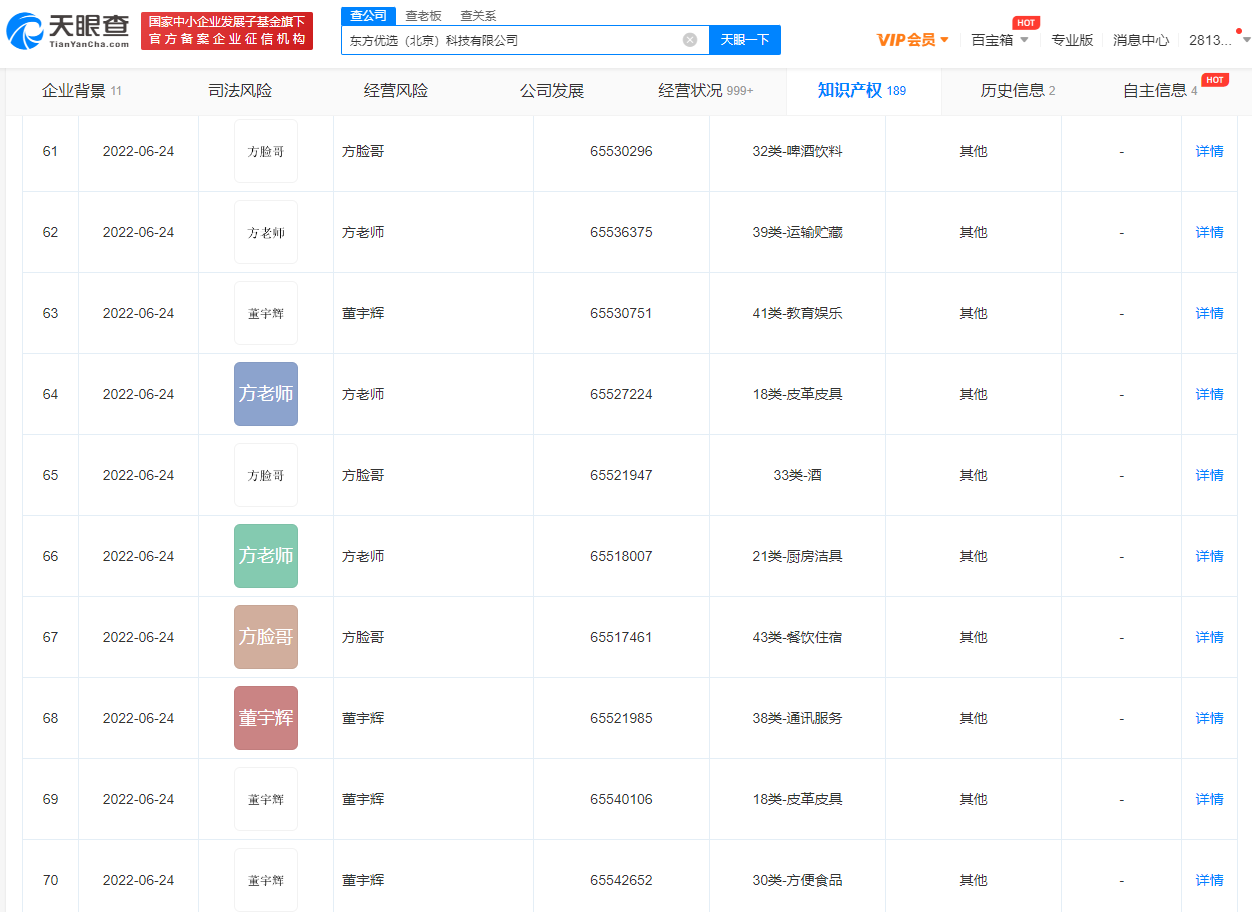 据天眼查App显示,近日,东方优选(北京)科技有限公司申请注册多个“东方甄选”直播间主播名字商标,包括“董宇辉”“方脸哥”“王涛顿顿”“孙楚涵悠悠”“石明明明”等,国际分类涉及教育娱乐、广告销售等,当前商标进度均为申请中。