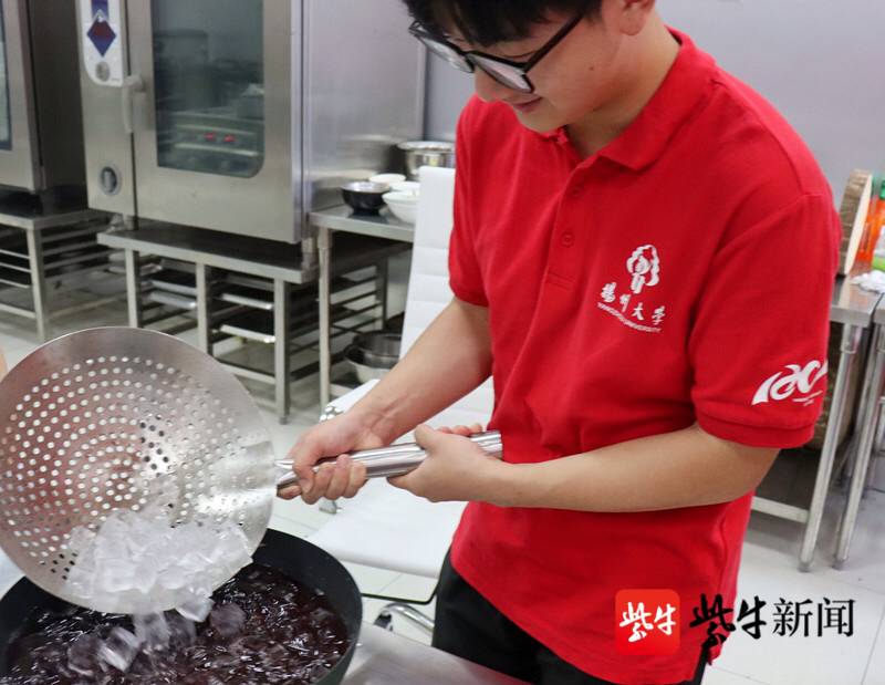 在学院实验室里,记者看到,该团队烹饪与营养教育专业的学子发挥专业特长,用古法熬制酸梅汤。酸梅汤成品出炉后,团队成员先品尝味道,再往里面加入冰糖调整口感。考虑到刚煮出来的酸梅汤不适合在炎热天饮用,团队成员早早地将酸梅汤静置冷却后,加入冰块。酸梅汤盛入保温瓶中后,团队成员走向高温下忙碌的人们,为他们送上一份独特的夏日心意。