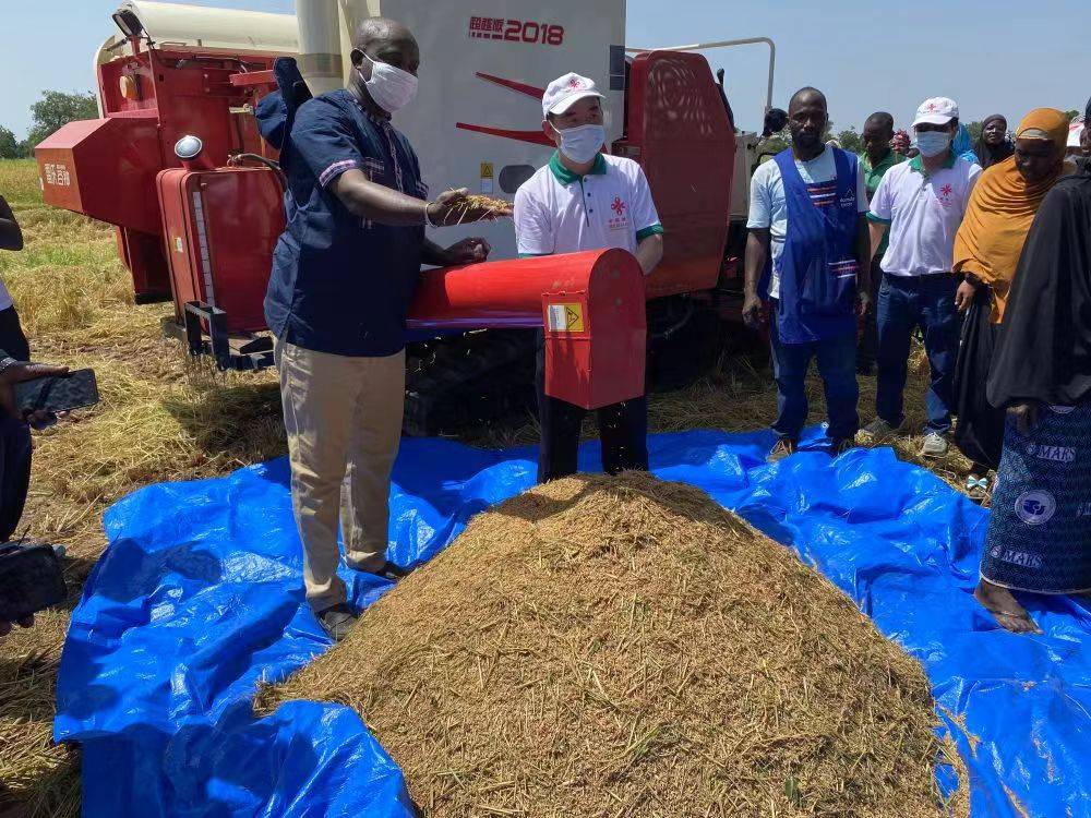 中国专家组成员在布基纳法索中西大区水稻示范区指导机械化水稻收割作业。