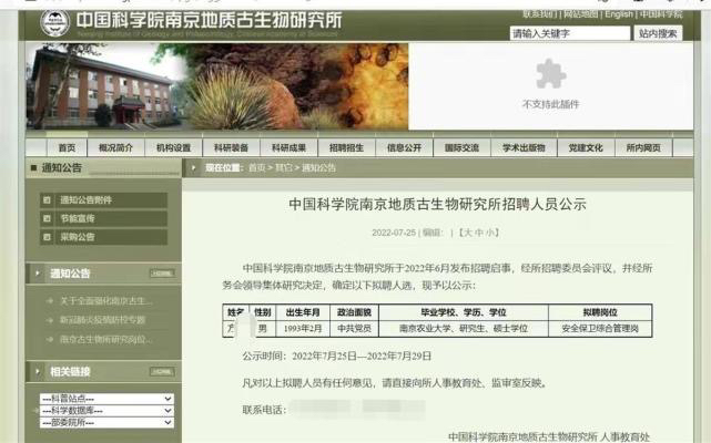 中国科学院南京地质古生物研究所目前是我国唯一的从事古生物学(古无脊椎动物学与古植物学)和地层学研究的专业机构。记者获悉,此事源于7月25日,中国科学院南京地质古生物研究所在其官方网站发布了一则招聘人员公示公告。其中显示,经该所招聘委员会评议,经所务领导集体决定,拟聘用一名方姓男子到研究所任安全保卫综合管理岗一职。该男子毕业于南京农业大学,1993年出生,学历为硕士。