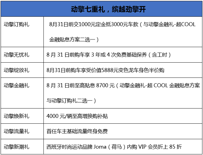 在公布售价的同步,吉利汽车也为缤越COOL用户推出了“动擎订购礼”“动擎无忧礼”“动擎绽放礼”“动擎金融礼”等七重购车礼遇,具体如下: