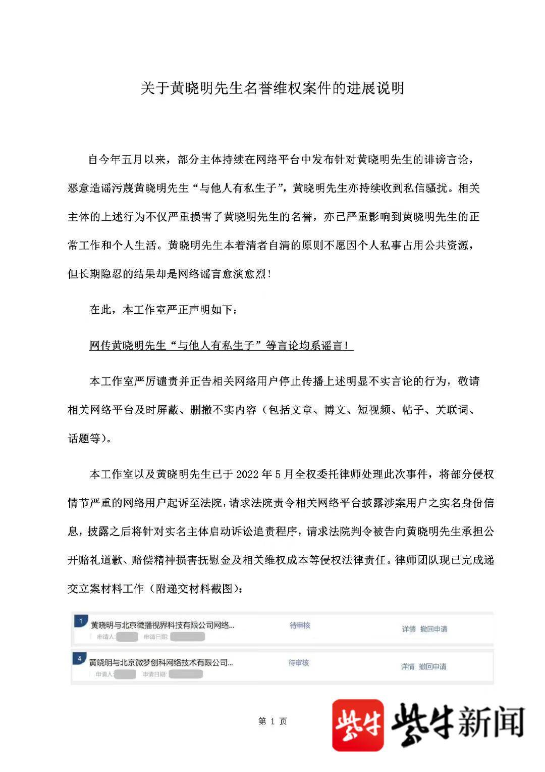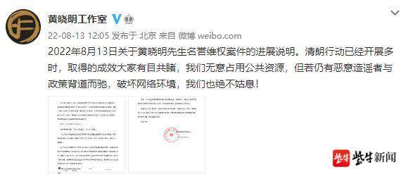 黄晓明及其工作室已于2022年5月全权委托律师处理此次事件,将部分侵权情节严重的网络用户起诉至法院,请求法院责令相关网络平台披露涉案用户之实名身份信息,披露之后将针对实名主体启动诉讼追责程序,请求法院判令被告向黄晓明承担公开赔礼道歉、赔偿精神损害抚慰金及相关维权成本等侵权法律责任。