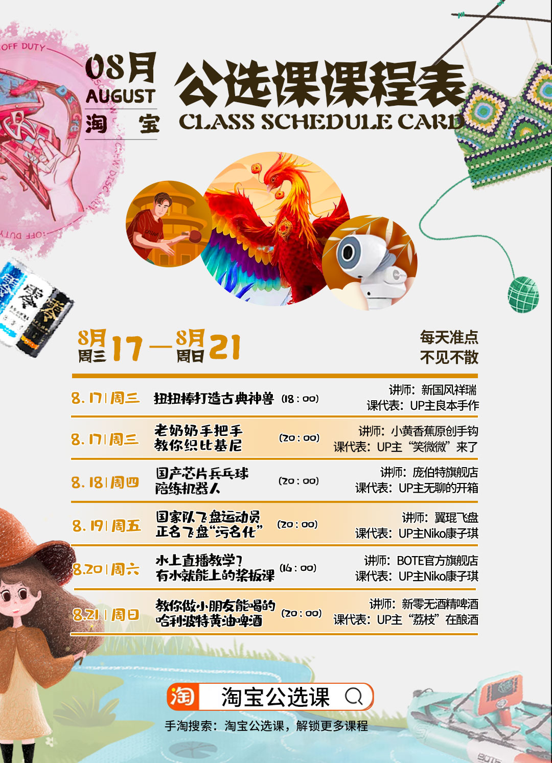 不止于此,本期淘宝公选课还包括:年轻人夏日解暑的“桨板”运动,BOTE官方旗舰店将提供桨板“从入门到精通”教学;登上央视的“庞博特机器人”团队,将用实际应用经验告诉公众,国产芯片性能如何,给产品又带来了哪些变化;以及“新零无酒精啤酒”创始人,一个又菜又爱喝的大男孩,将回应外界对“无酒精啤酒”的质疑:无酒精还能叫啤酒吗,喝完能开车吗?以及如何在家里复刻“黄油啤酒”的无酒精版。
