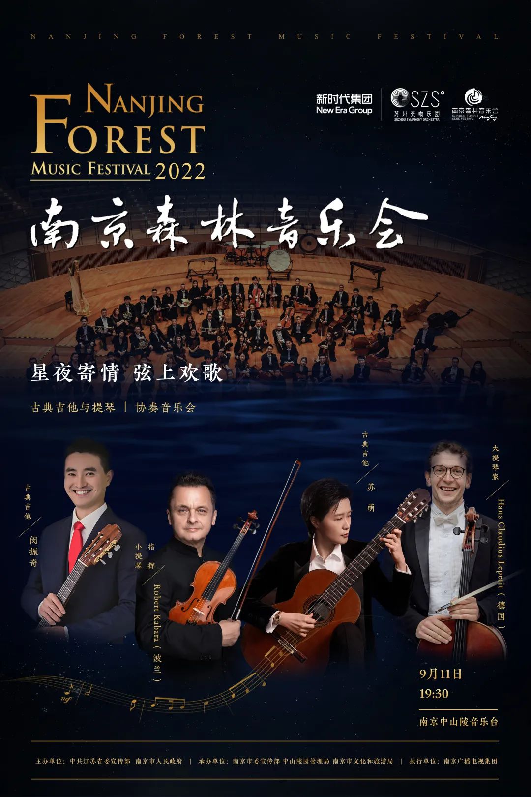 9月11日 ,古典吉他首次在南京森林音乐会亮相。波兰指挥家卡巴拉同时担任指挥与小提琴独奏,一人分饰两角“自拉自指”。还有古典吉他演奏家苏萌、闵振奇和德国大提琴家汉斯·克劳迪斯·莱佩特带来的精彩合奏。这也是年度最值得期待的古典吉他与提琴音乐会。