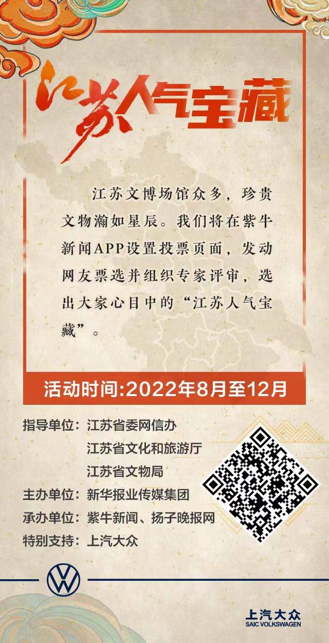 由江苏省委网信办、江苏省文化和旅游厅、江苏省文物局指导,新华报业传媒集团主办,紫牛新闻、扬子晚报网承办的“江苏人气宝藏”系列活动正式拉开帷幕,由广大读者网友投票并结合专家评比,将有十三件宝物代表着江苏十三个城市脱颖而出。