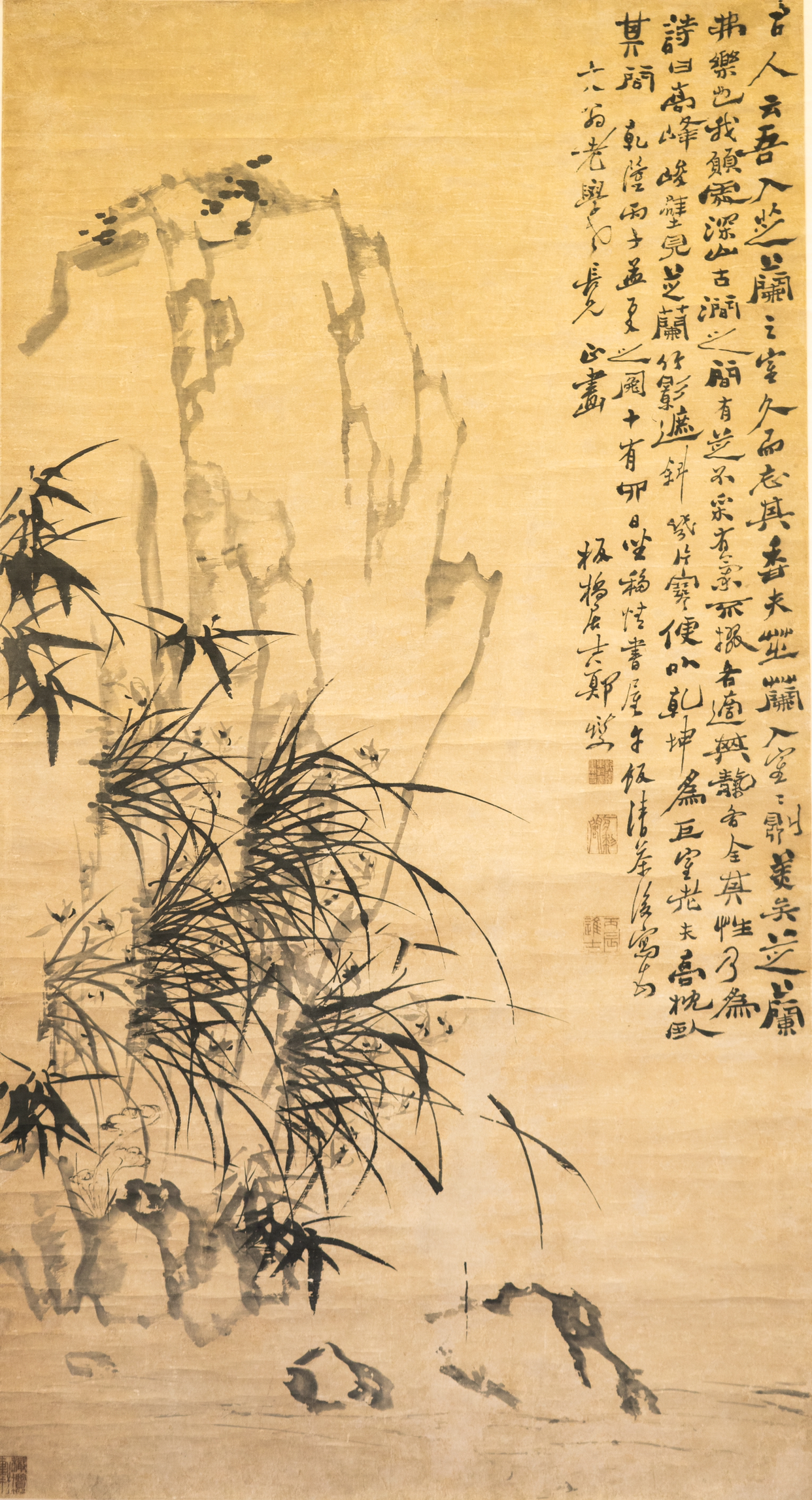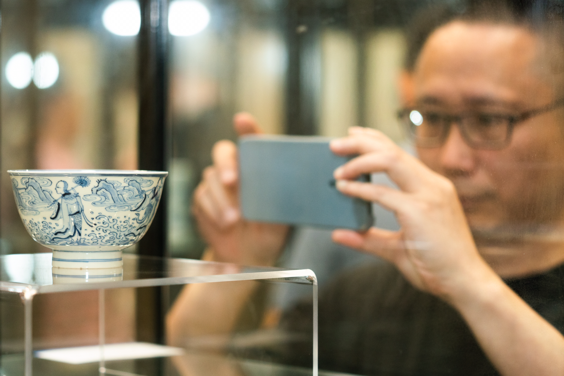 “明永乐·青花缠枝花卉葡萄纹海水折沿大盘,是永宣时期的经典样式。构图疏朗而饱满,笔触婉转流畅。唐伯虎绢本中堂‘怀楼图’,画幅的左上方有唐寅亲笔题画诗及款识:‘百尺高楼寄所怀,暮烟如絮接天涯。望时多有思亲念,泪眼迷茫手自揩。怀楼图,唐寅为鸣远蒋乡兄写’。”上海天物博物馆馆长、景德镇陶瓷大学御窑研究所所长钱伟鹏说,唐伯虎与沈周、文徵明、仇英合称“明四家”。擅长诗文书画,作品多以人物、花卉为主,山水画不多见。这件《怀楼图》是他为同乡蒋鸣远所作,描绘的是山水,且这么大篇幅,十分罕见,具有极高的收藏价值,“从诗文可以看出,画思亲念长之意,寄托了唐伯虎的淳朴情感,体现了唐寅绘画情景交融、诗画共汇的艺术风格。”