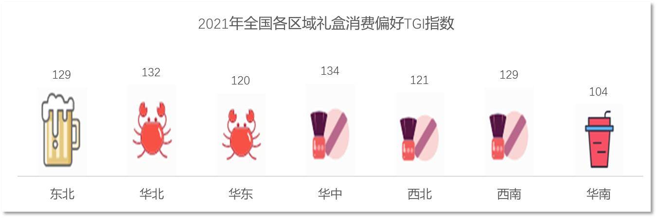 从中国各区域的京东销售情况来看,在2021年购买礼盒的用户中,东北最偏好酒类的礼盒,华北和华东喜欢购买生鲜礼盒,而包括华中、西北、西南在内的广袤的中西部地区最喜欢美妆护肤礼盒,华南则最偏好食品饮料礼盒。