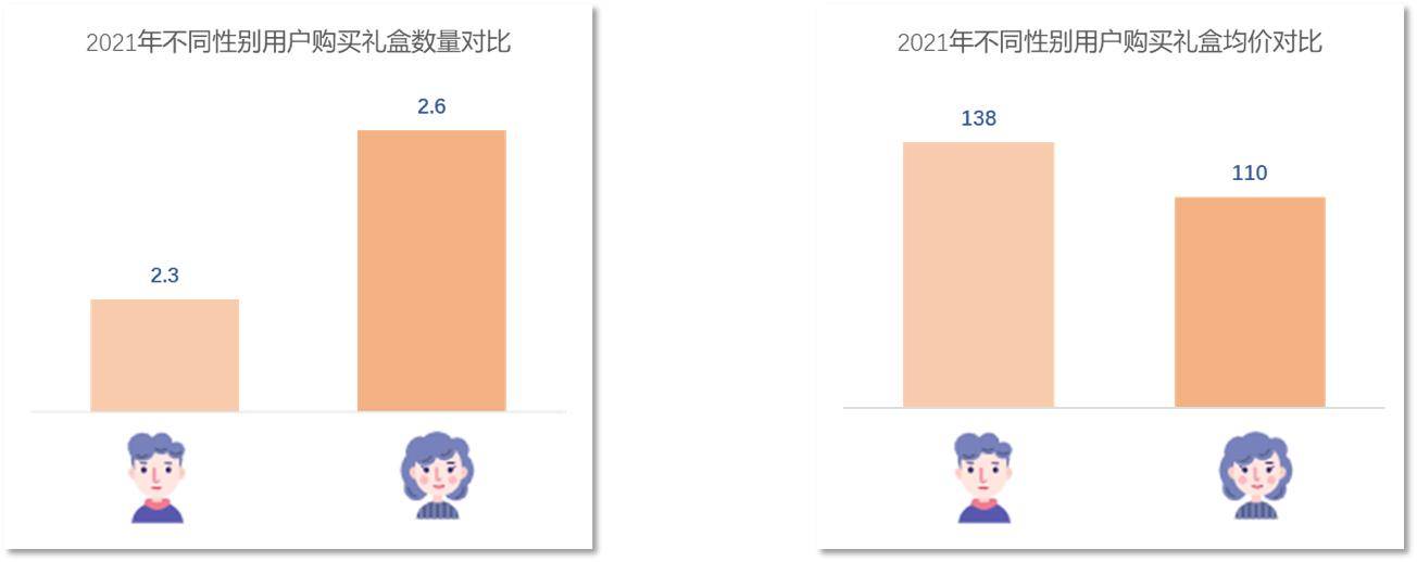京东销售情况显示,在2021年购买礼盒的用户中, 女性用户人均购买礼盒2.6个,是男性的1.1倍;而男性用户购买礼盒的均价为138元,是女性用户的1.26倍。