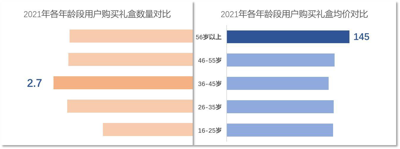京东销售情况显示,在2021年购买礼盒的用户中, 36-45岁用户买的最多,人均2.7个礼盒;而56岁以上用户买的礼盒最贵,均价145元。