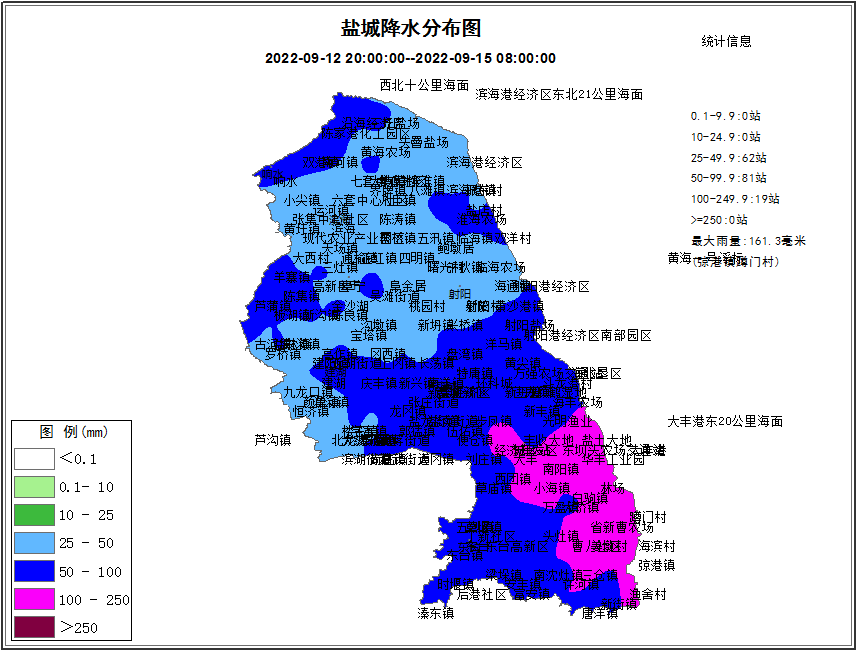 自9月12日20时到15日08时,盐城中北部出现大到暴雨、南部暴雨到大暴雨,同时伴有8~11级阵风。据统计:9月12日20时到15日08时,加密自动站中有100个站降水量超过50mm,其中19个站超过100mm,最大161.3mm,出现在东台市弶港镇蹲门村,最大小时雨强49mm(盐都区张庄街道,14日22-23时)。共有48个站阵风8级以上,其中12个站阵风9级,7个站阵风10级,1个站阵风11级,最大风速32m/s,出现在东台国华四期海上升压站。