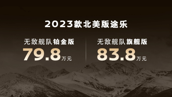 2023款北美版途乐(以下简称北美版途乐)近日正式上市,共发布两款车型,无敌舰队旗舰版(预售顶配版)售价83.8万元,无敌舰队铂金版(中配版)售价79.8万元。