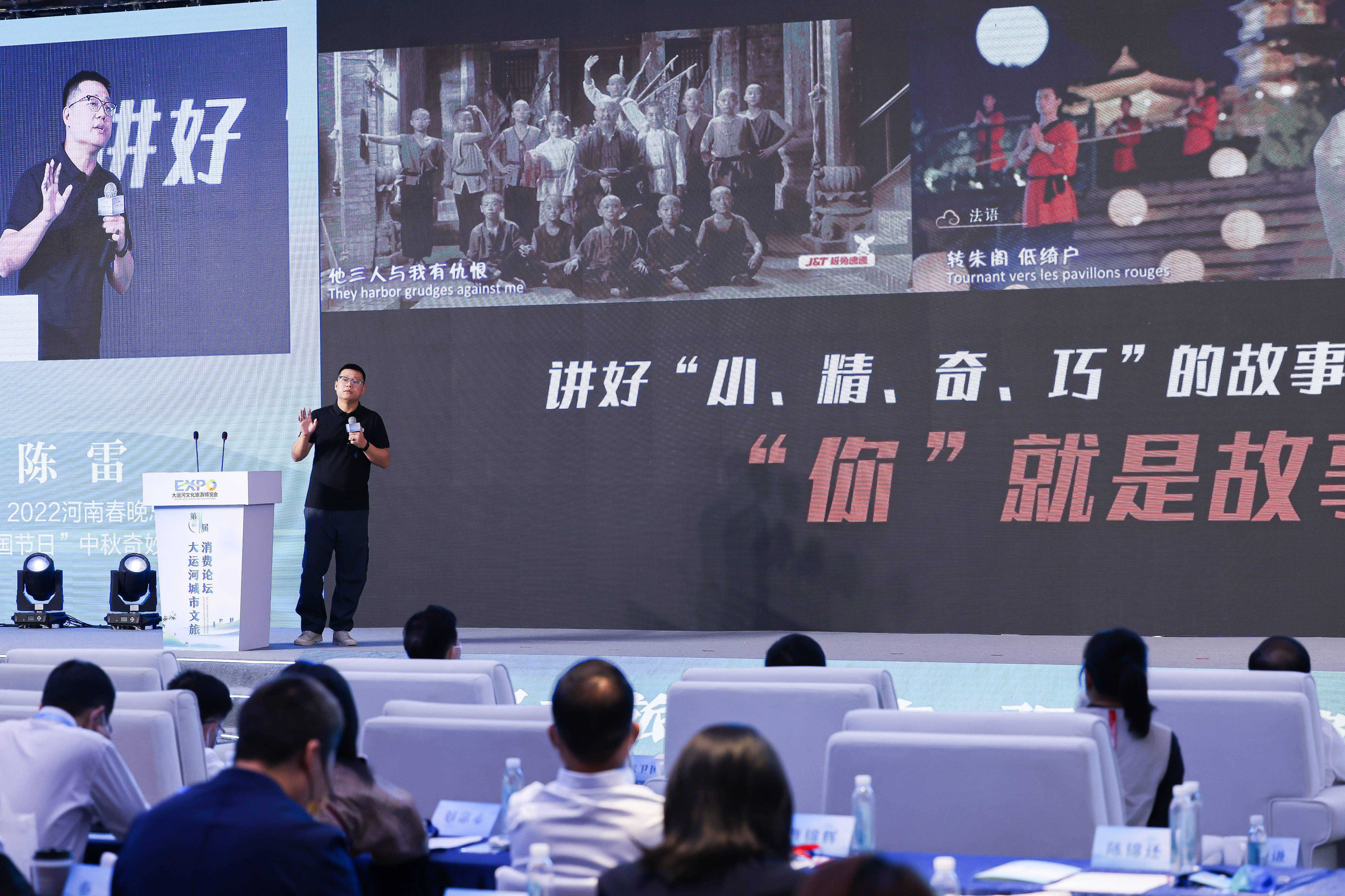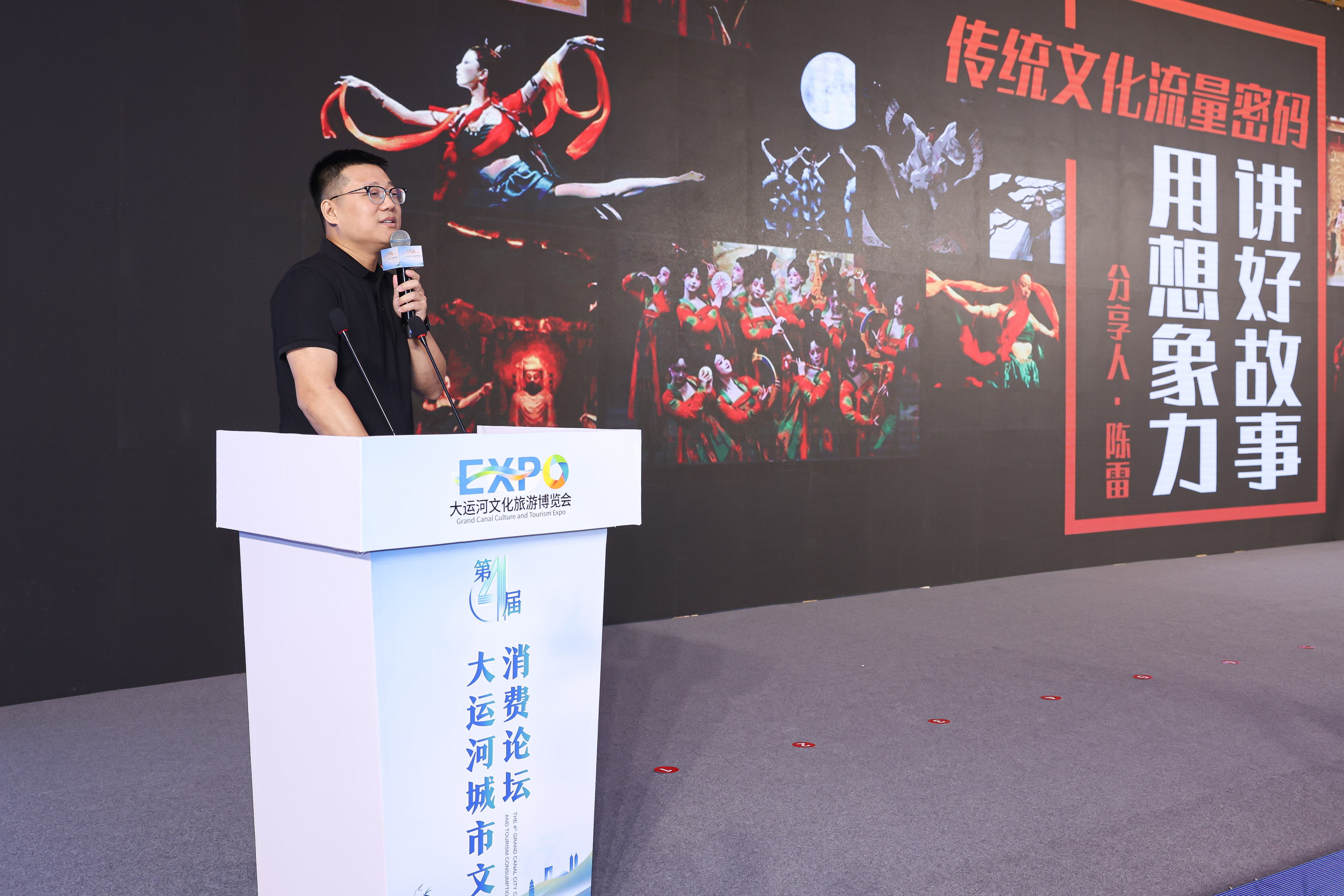 9月23日,2022年第四届大运河文化旅游博览会期间,大运河城市文旅消费论坛在苏州国际博览中心举行。2021、2022河南春晚总导演,2022“中国节日”中秋奇妙游总导演之一陈雷做了题为《用想象力讲好故事》的主题分享,解码传统文化的流量密码。采访中他对记者表示,对大运河深度开发,在于讲好故事,关于运河的想象力,通向未来。