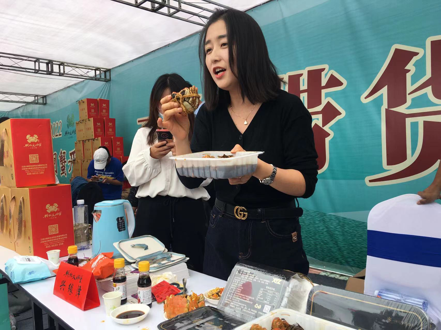 开捕仪式现场,还举行了挑蟹技能大赛,只见一位位挑蟹师傅仅靠手掂估算出的螃蟹重量和实际称重误差很小,令人赞叹不已。不仅如此,大闸蟹捕捞上来后,在网络直播达人们的卖力“吆喝”下,一箱箱大闸蟹通过快递陆续发往全国。