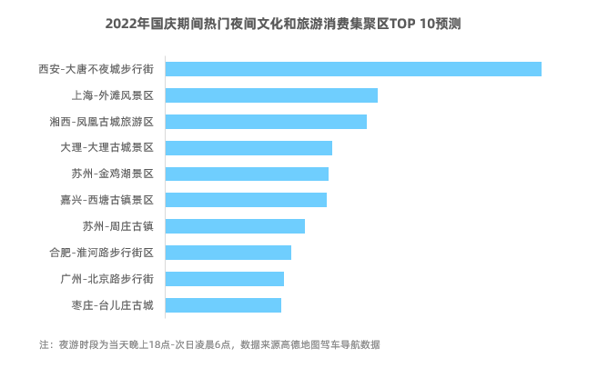 报告指出,2022年国庆期间,预计西安-大唐不夜城步行街、上海-外滩风景区、湘西-凤凰古城旅游区、大理-大理古城景区、苏州-金鸡湖景区、嘉兴-西塘古镇景区、苏州-周庄古镇、合肥-淮河路步行街区、广州-北京路步行街、枣庄-台儿庄古城将成为全国十大热门夜间文化和旅游消费集聚区。提醒夜间行车的游客注意行车安全,切勿疲劳驾驶。