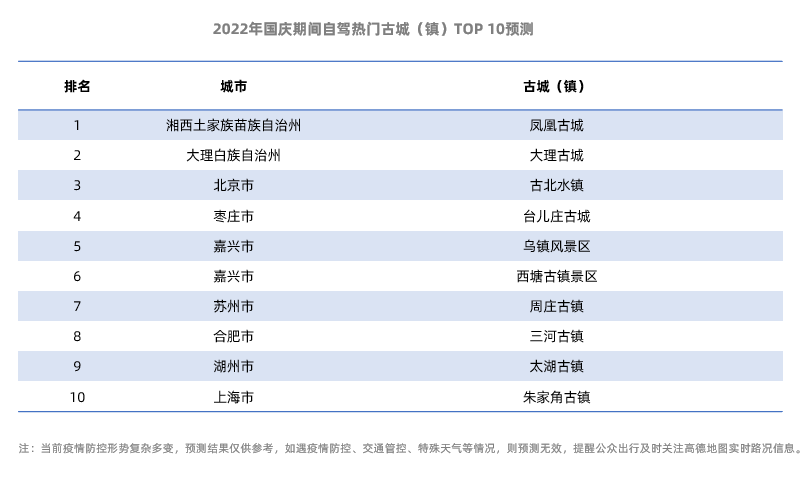 报告还指出,凤凰古城、大理古城、古北水镇、台儿庄古城、乌镇风景区、西塘古镇景区、周庄古镇、三河古镇、太湖古镇、朱家角古镇或将成为2022年国庆期间,最受欢迎的全国自驾热门古城(镇)。报告提醒公众自驾前往景区时尽量提前做好停车规划,可以考虑将车停泊在较远的停车场,步行前往;或是打车、乘坐公共交通出行。
