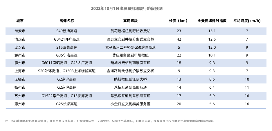 预计2022年10月1日(国庆长假第一天)全国高速出程易拥堵缓行路段主要有S49新扬高速淮安段(黄花塘枢纽到盱眙收费站),全天拥堵延时指数约15.1,平均车速约7km/h。其次是G0421许广高速清远段(清远立交到井塘分离式立交桥)以及S15汉蔡高速武汉段(索子长河二号桥到G50沪渝高速)。以下重点拥堵缓行路段交通压力大,提醒公众出行时合理避堵。