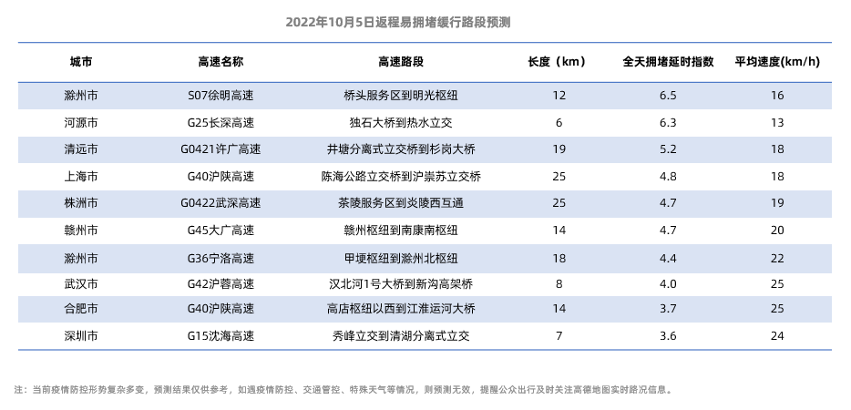 报告指出,2022年10月5日(国庆长假第五天)全国高速返程较易拥堵的路段主要是S07徐明高速滁州段(桥头服务区到明光枢纽),全天拥堵延时指数约6.5,平均速度约为16km/h,其次是 G25长深高速河源段(独石大桥到热水立交)以及G0421许广高速清远段(井塘分离式立交桥到杉岗大桥)等。预计以下路段交通压力较大,建议途经的车主时刻注意路况,合理避堵。