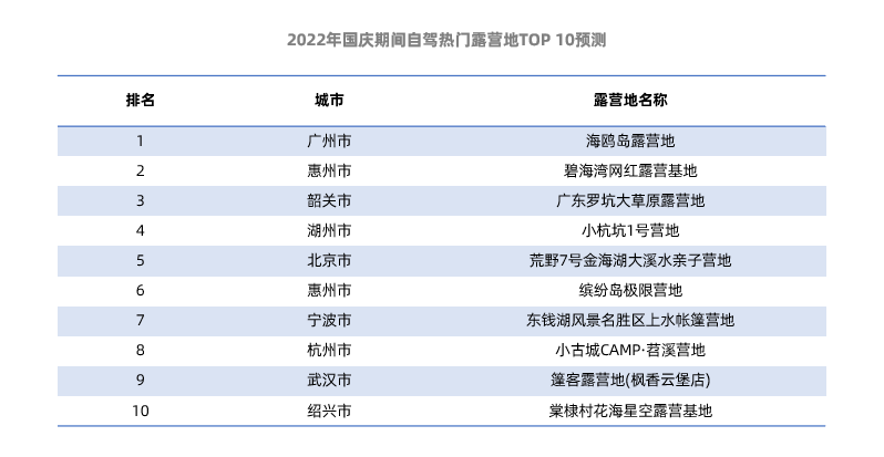 预计2022年国庆期间,全国自驾热门露营地将包含广州市-海鸥岛露营地、惠州市-碧海湾网红露营基地、韶关市-广东罗坑大草原露营地、湖州市小杭坑1号营地、北京-荒野7号金海湖大溪水亲子营地等。入秋后,昼夜温差较大,提醒露营的游客携带好保暖装备,以防感冒;另外国庆期间露营地人流量较大,提醒前去的游客看好老人和小孩。