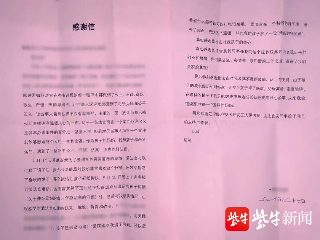 去年“六一”儿童节前,曹某将一封感谢信和锦旗送到江宁经济技术开发区法院,在感谢信中她将孟如歌法官称作孩子的“美丽的守护神”。她告诉孟如歌自己收到了判决书,并称这是“我们家收到的最好的儿童节礼物”。