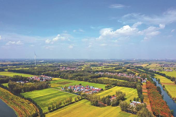 睢宁县官山镇,蓝天白云下的金黄色稻田与村庄相映成景。 洪星 摄 (视觉江苏网供图)