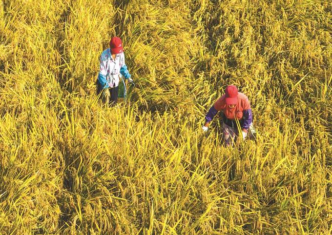 泰州市海陵区苏陈镇虹东村稻浪滚滚,满眼金黄,丰收在望。 汤德宏 摄