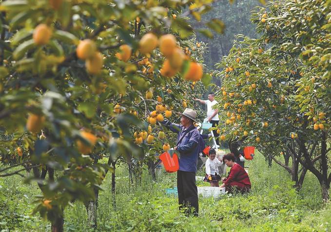 沭阳县贤官镇大房村果农正忙着采摘成熟的牛心柿。 丁华明 摄