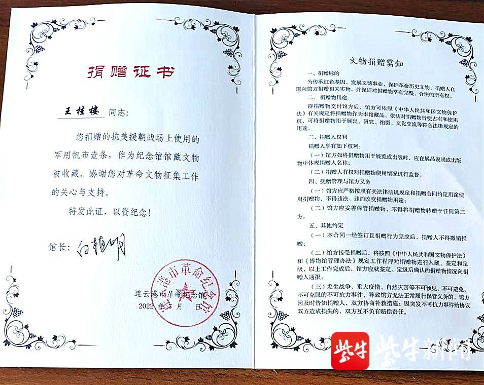 王志高告诉记者,这块帆布父亲已经保存了70年,作为子女,为了把父辈的斗争精神传承下去,教育更多的后来者“铭记历史、珍爱和平”,今年7月,他们把这块帆布捐赠给了连云港市革命纪念馆。“父亲教育我们,正是因为志愿军战士以顽强战斗的精神和一不怕苦、二不怕死的革命斗志,战胜了以美国为首的联合国军,夺取了伟大的抗美援朝战争的胜利,这块帆布就是最好的见证。”
