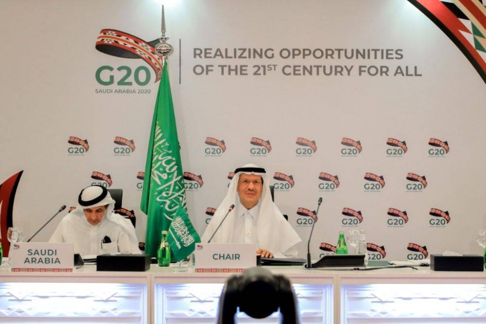 这是2020年4月10日,在沙特阿拉伯利雅得,沙特能源大臣阿卜杜勒-阿齐兹·本·萨勒曼(右)出席二十国集团(G20)能源部长会议。新华社发