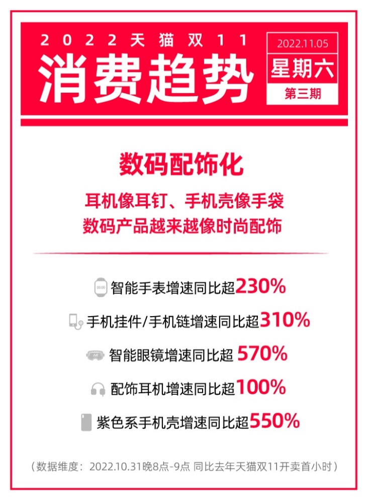此外,极具科技感和个性化的智能手表、智能眼镜、手机挂件/手机链等,在天猫双11开售首小时内,均获得超200%以上的快速增长。其中,智能手表销量超10万台,智能眼镜增长超5倍。