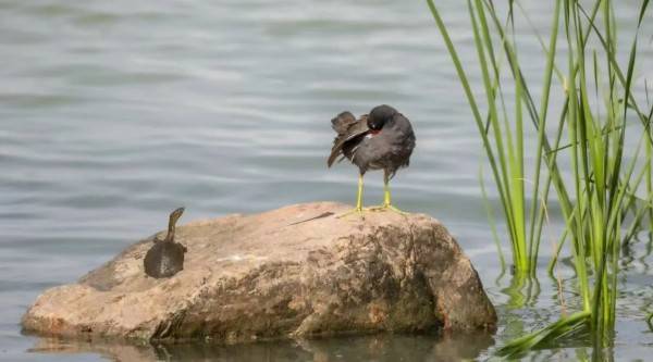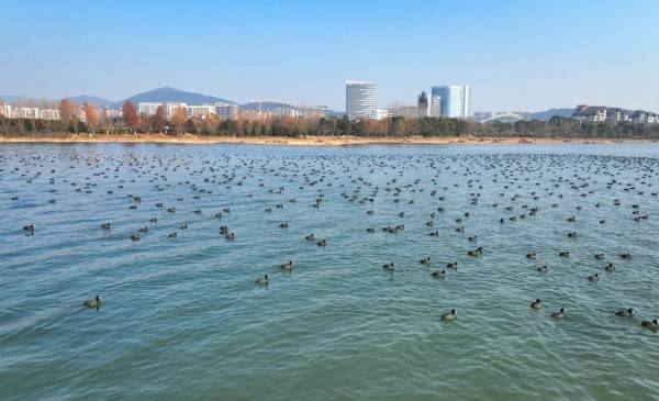 骨顶鸡属中型游禽,像小野鸭一样在开阔的水面上自在游泳,每年到来的数量很庞大。