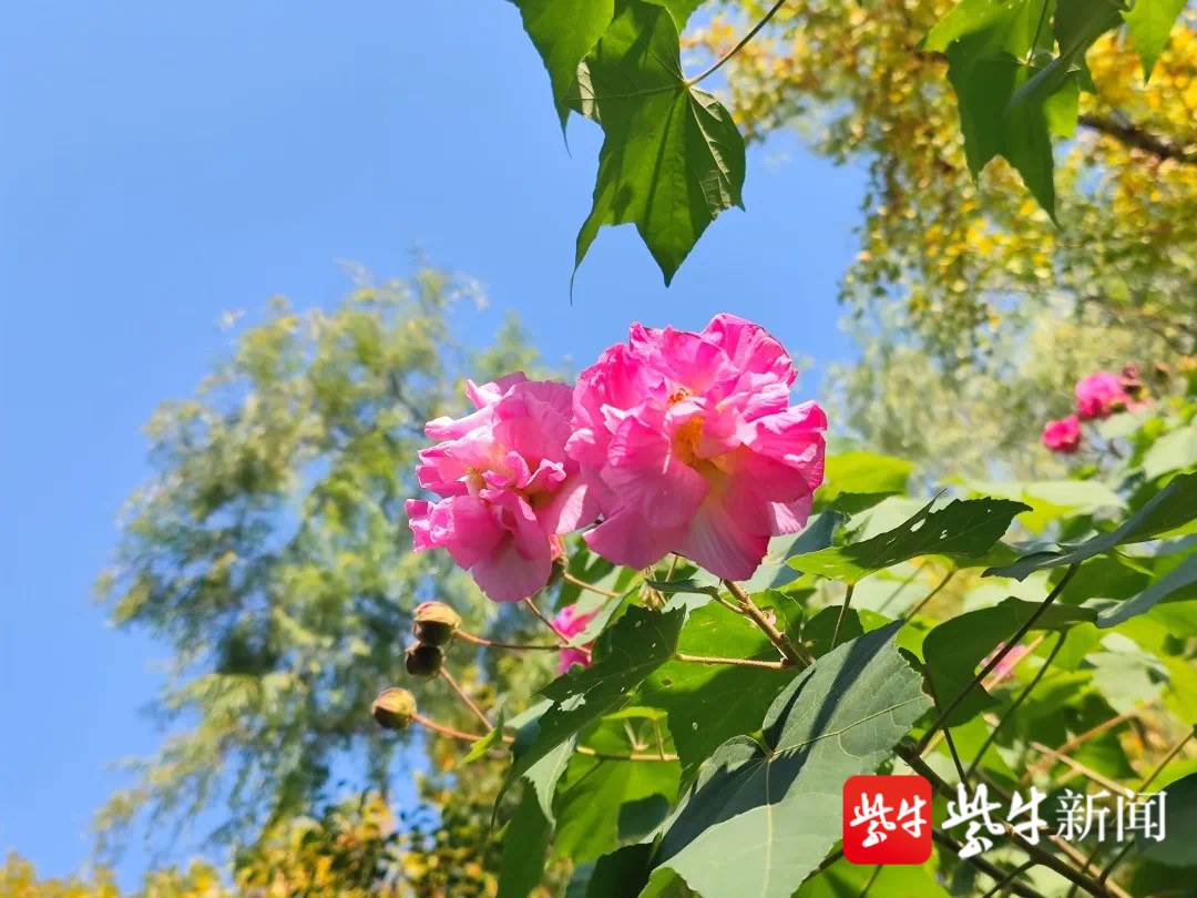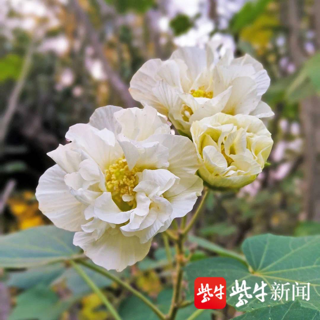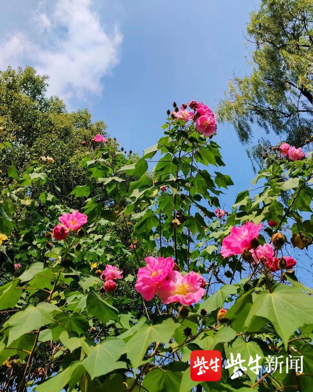 在众多秋花当中,一树多色的木芙蓉显得尤为奇特,或红或粉的芙蓉花点缀在翠绿的树上,在这秋冬之际竟能生出些许春意,不由得让人驻足欣赏,心生欢喜。