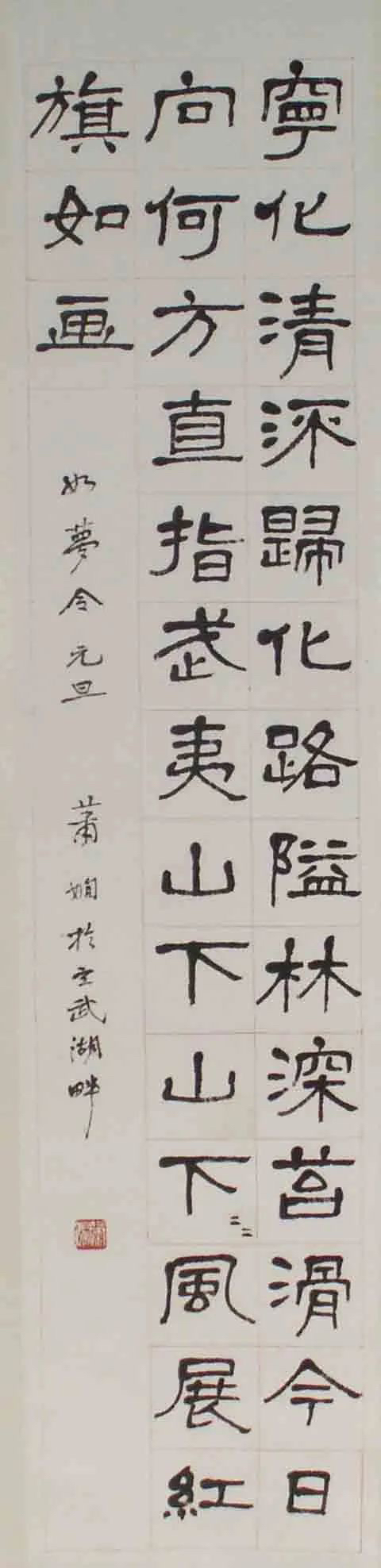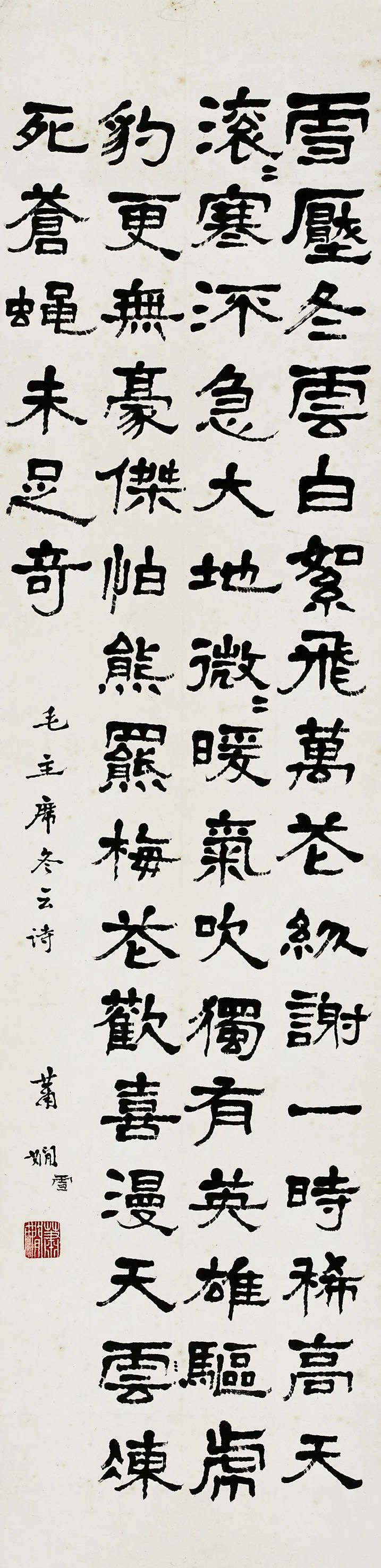 萧娴生于1902年,字稚秋,号蜕阁、枕琴室主,贵州贵阳人,曾工作于江苏省美术馆,是我国当代书法史上著名的女书法大家。萧娴幼承庭训,早年崇尚碑学,深得北派三昧。二十岁时康有为题诗赞其“雄深苍浑此才难”和“卫管重来主坫坛。”正式拜康有为为师后,她以“三石一盘”(石鼓文、石门颂、石门铭、散氏盘)为基础,汲取神髓,互为表里。中年遍历西南各地,后定居于六朝古都南京,平生瞩目自然,留情景物,山川奇气洋溢笔端,她既有“道登天门”豪迈胸襟,又有“江山多娇”的雅逸之气。萧老潜心笔墨的同时开阔见闻,伴随书法的研学之道,她亦抚琴吟诗,写梅治印,逐渐在磊落慷慨之中通乎造化。除此之外,她还心系国家、热衷公益,无论是为名胜作书,还是为支援慰问,她均不计报酬,认真创作。为推动书法艺术繁荣发展,萧娴广植桃李,业有所成,以其独树一帜的书风,广泛影响至当代的书法创作走向。