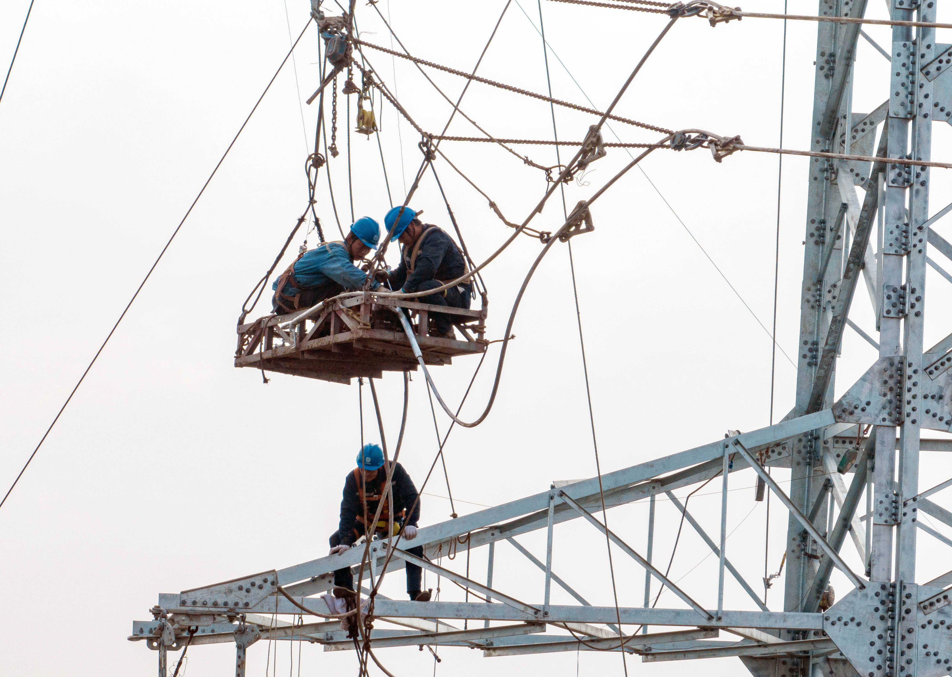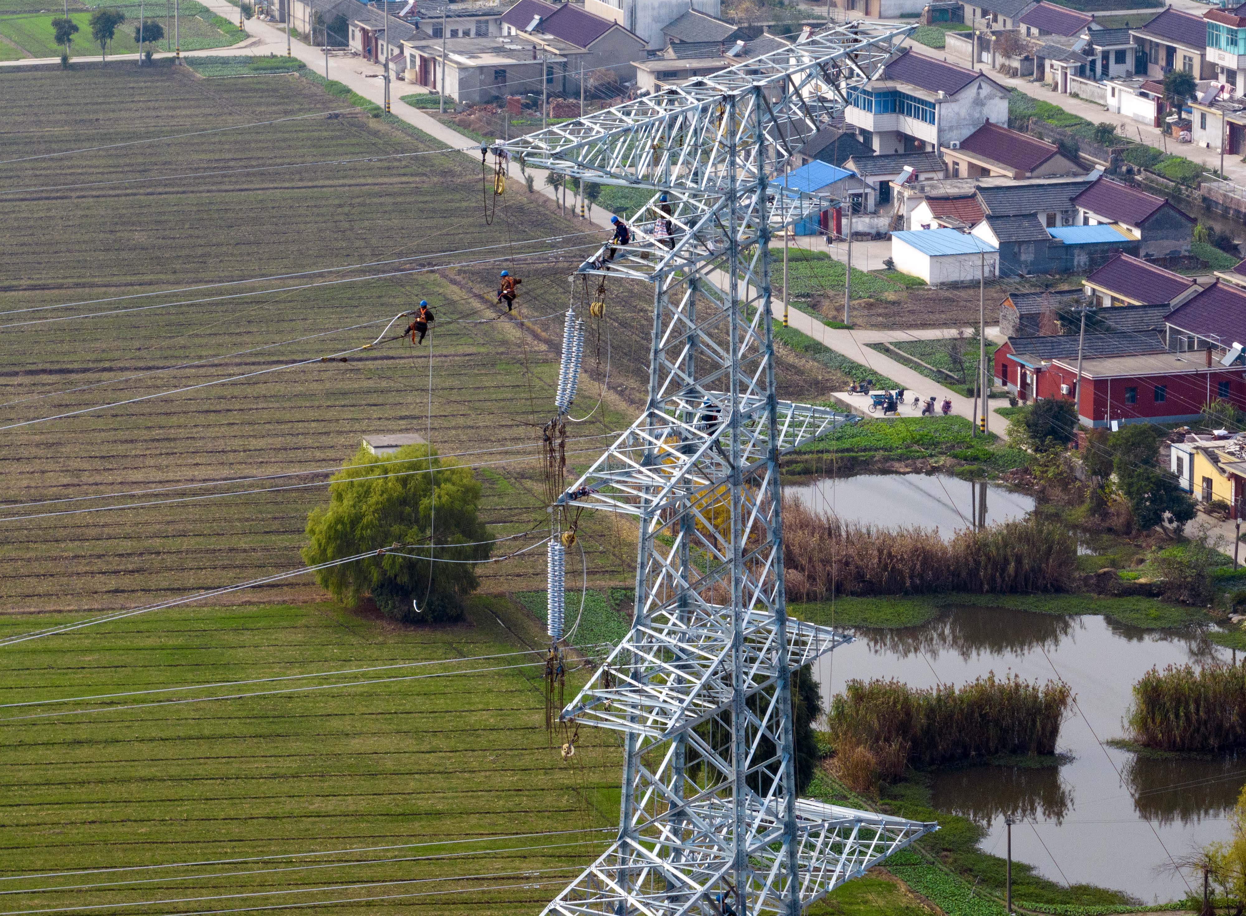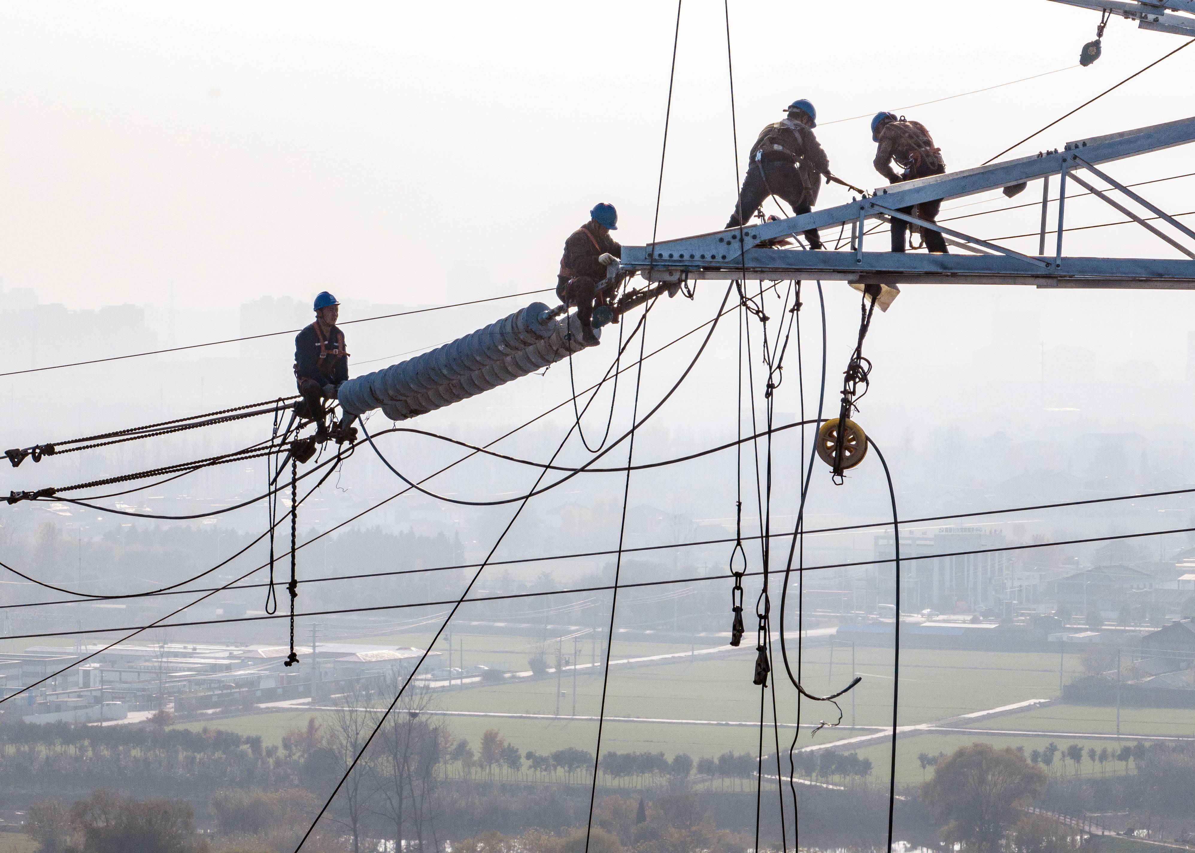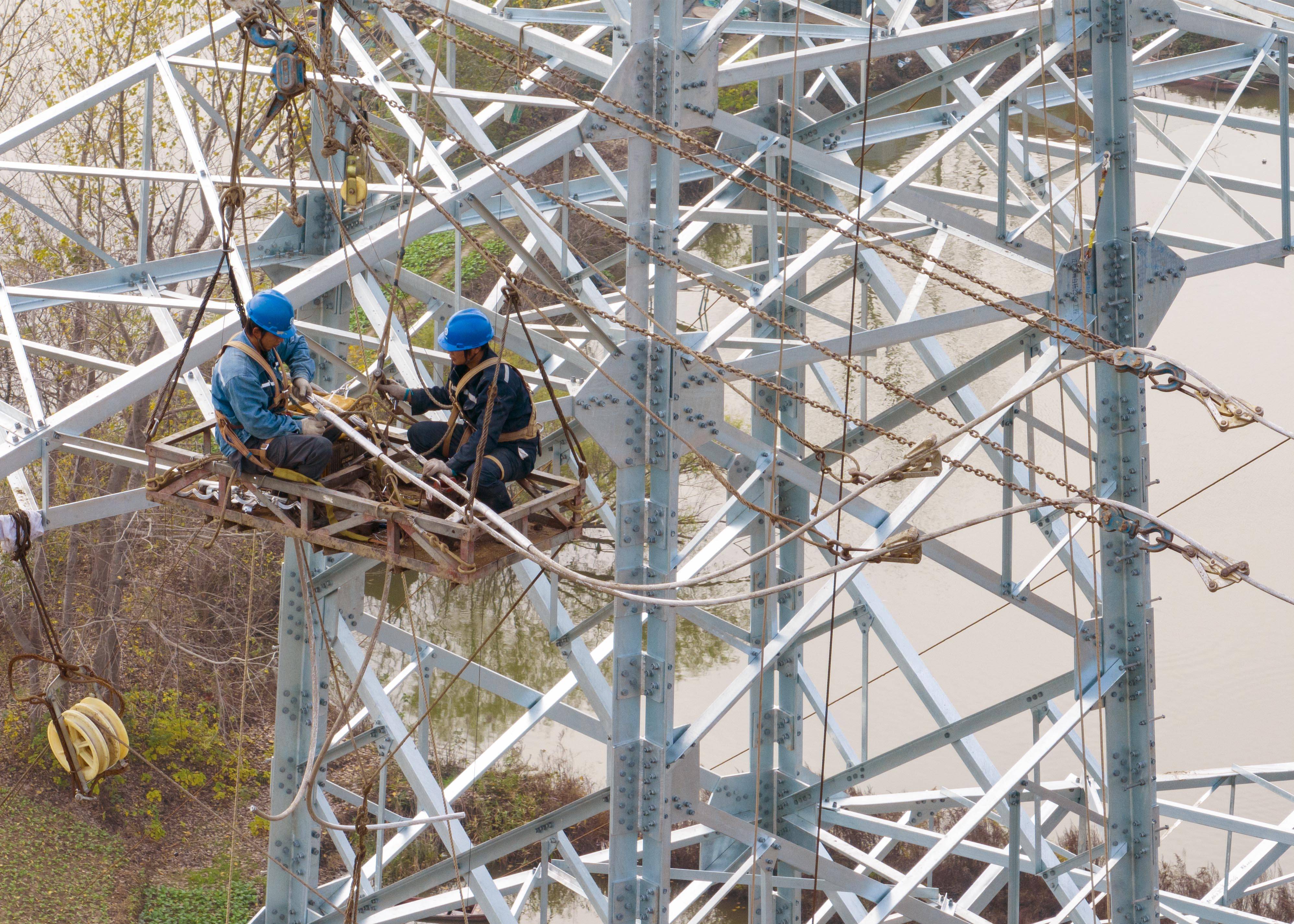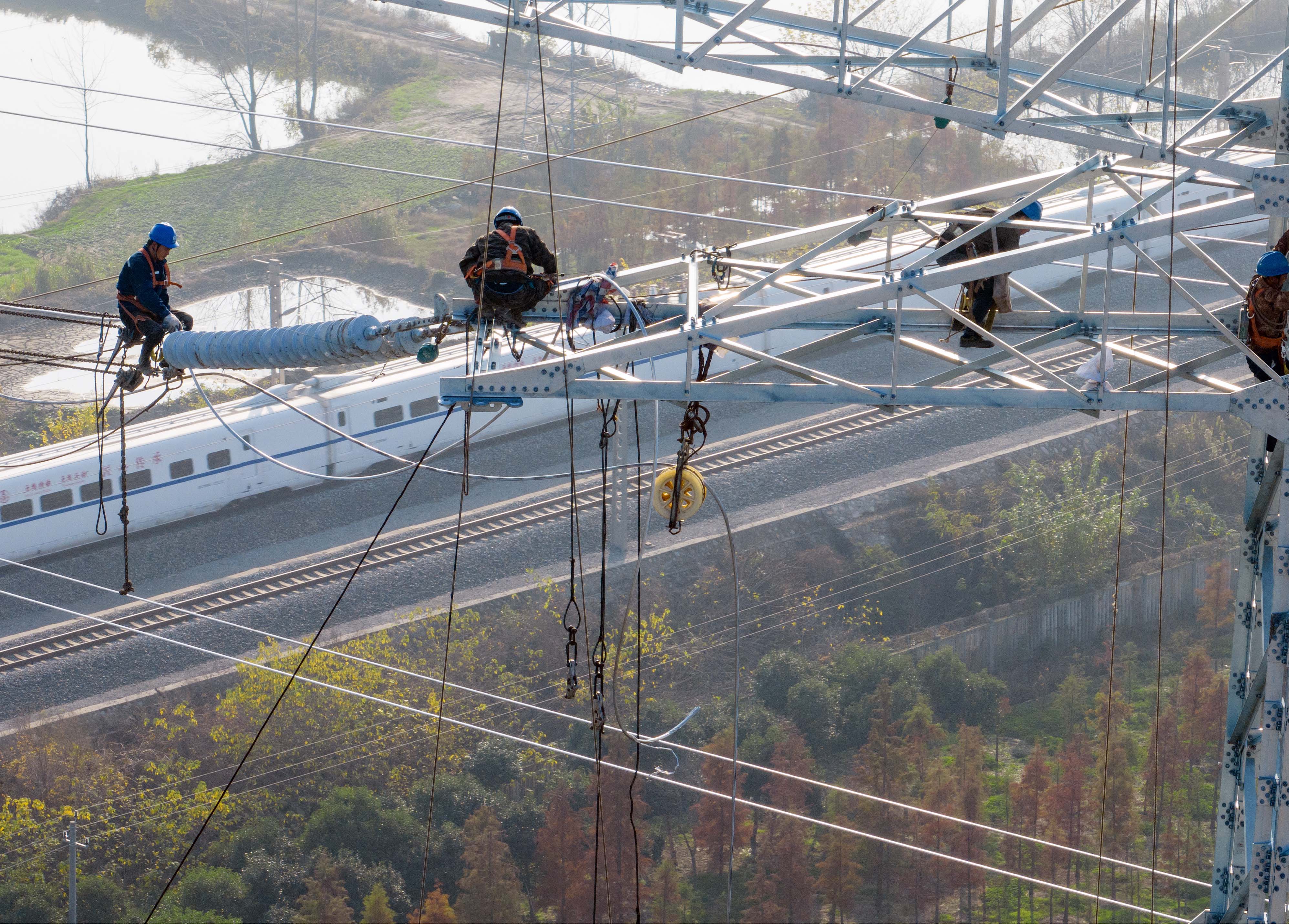 2022年11月25日,电力工人在江苏省泰州市姜堰区娄庄镇对新建220千伏白杨变电站配套出线工程跨越宁启铁路进行高空紧线作业。