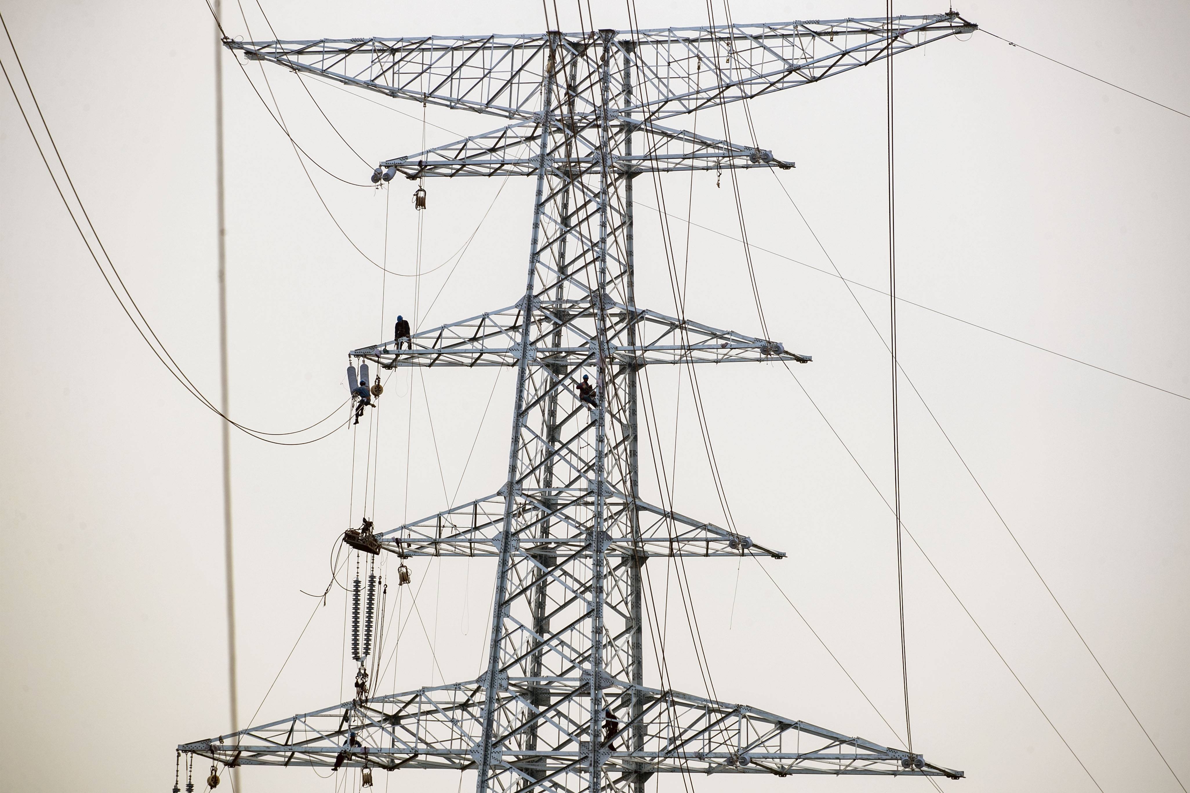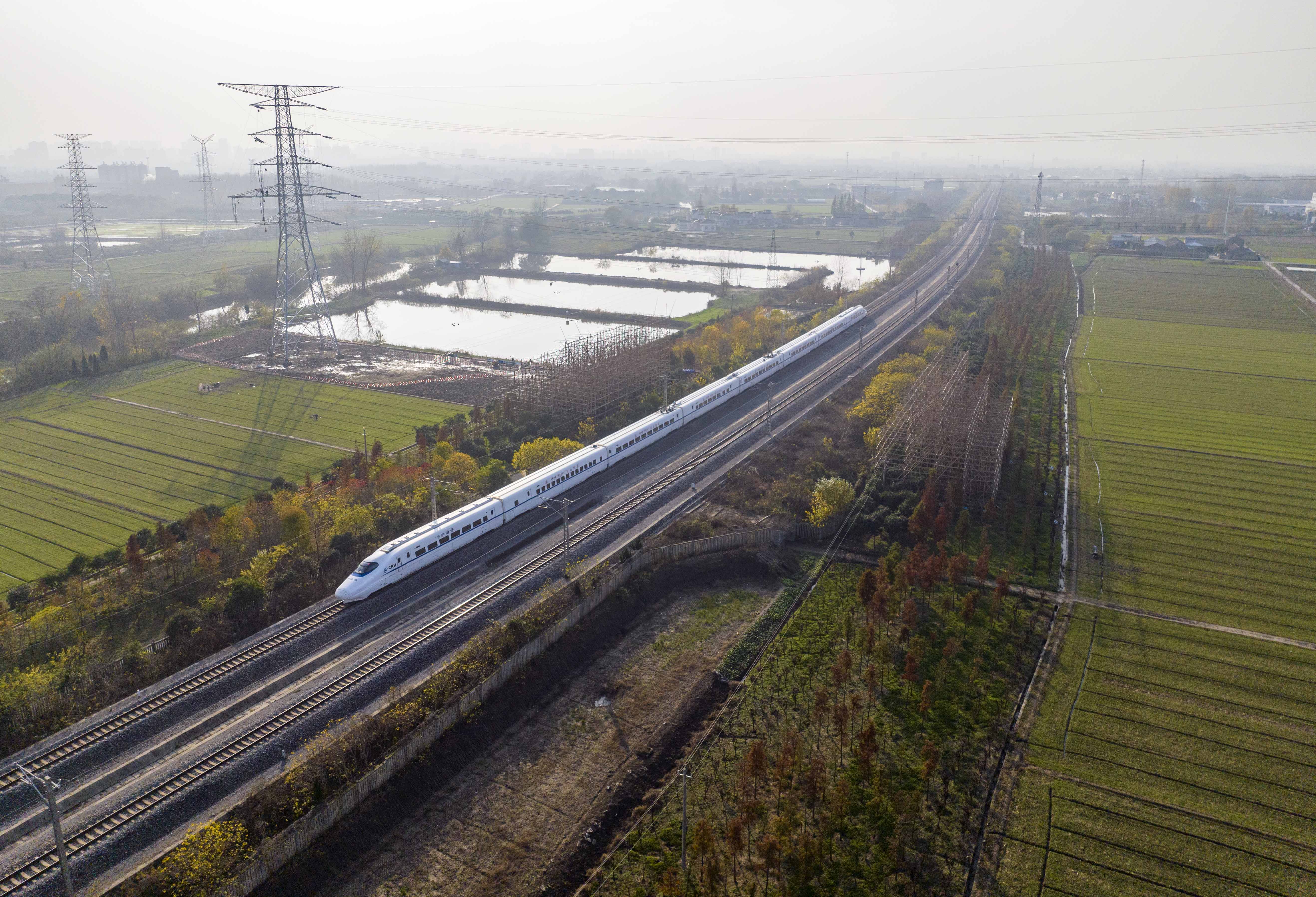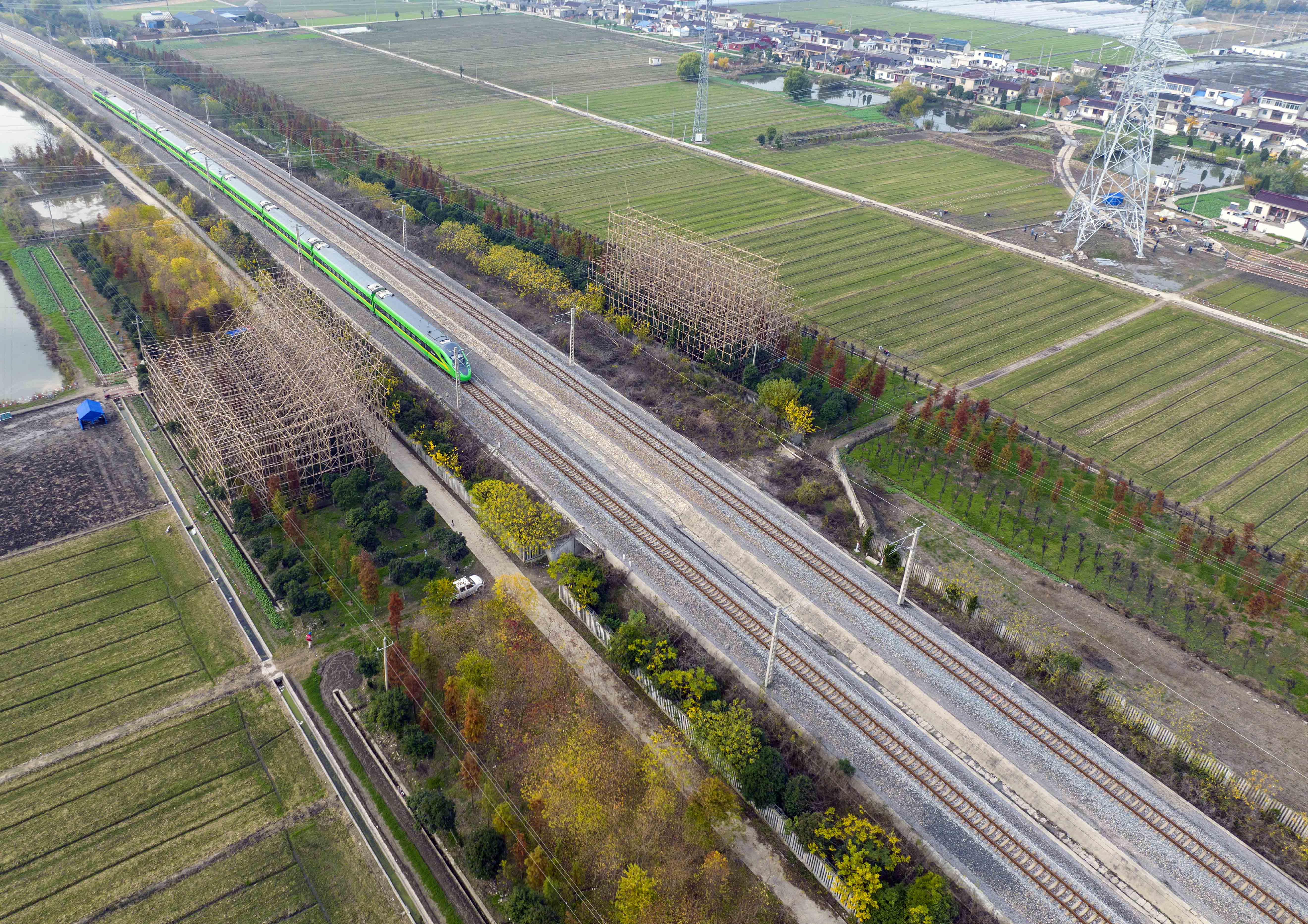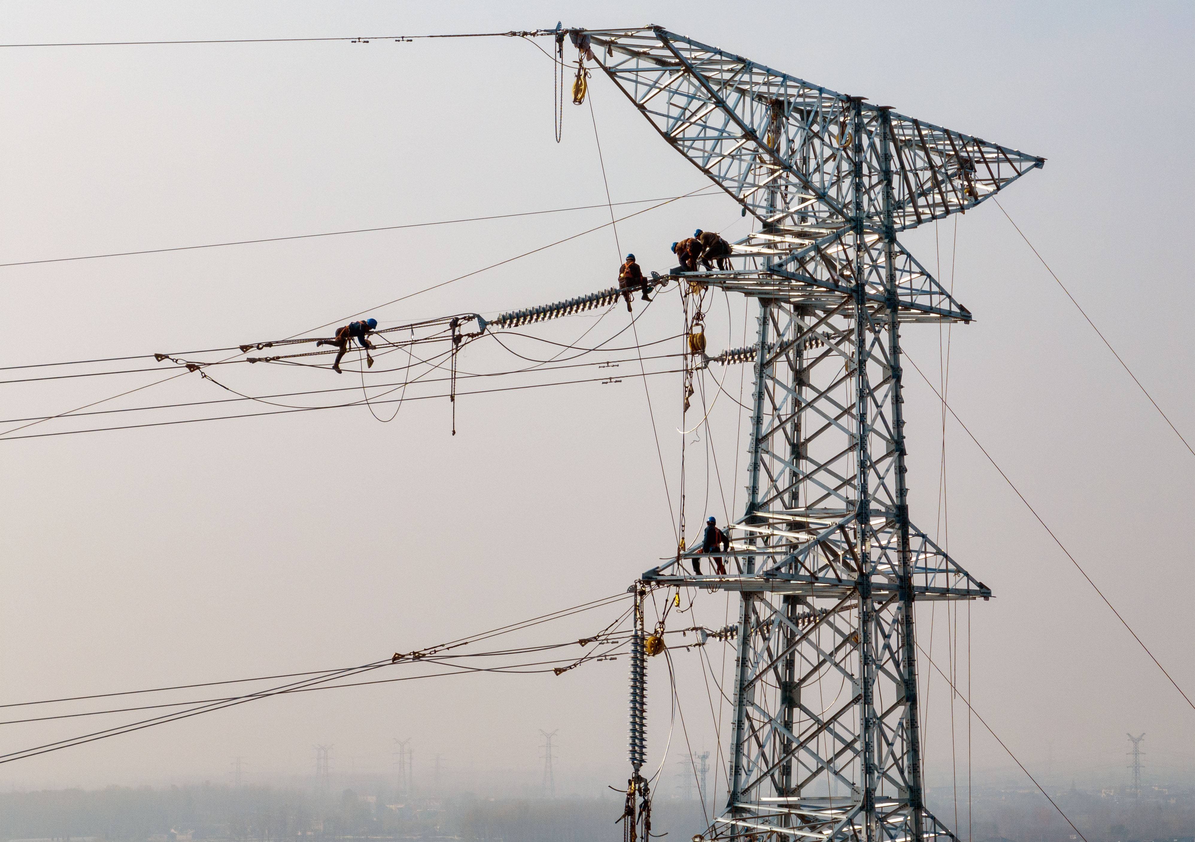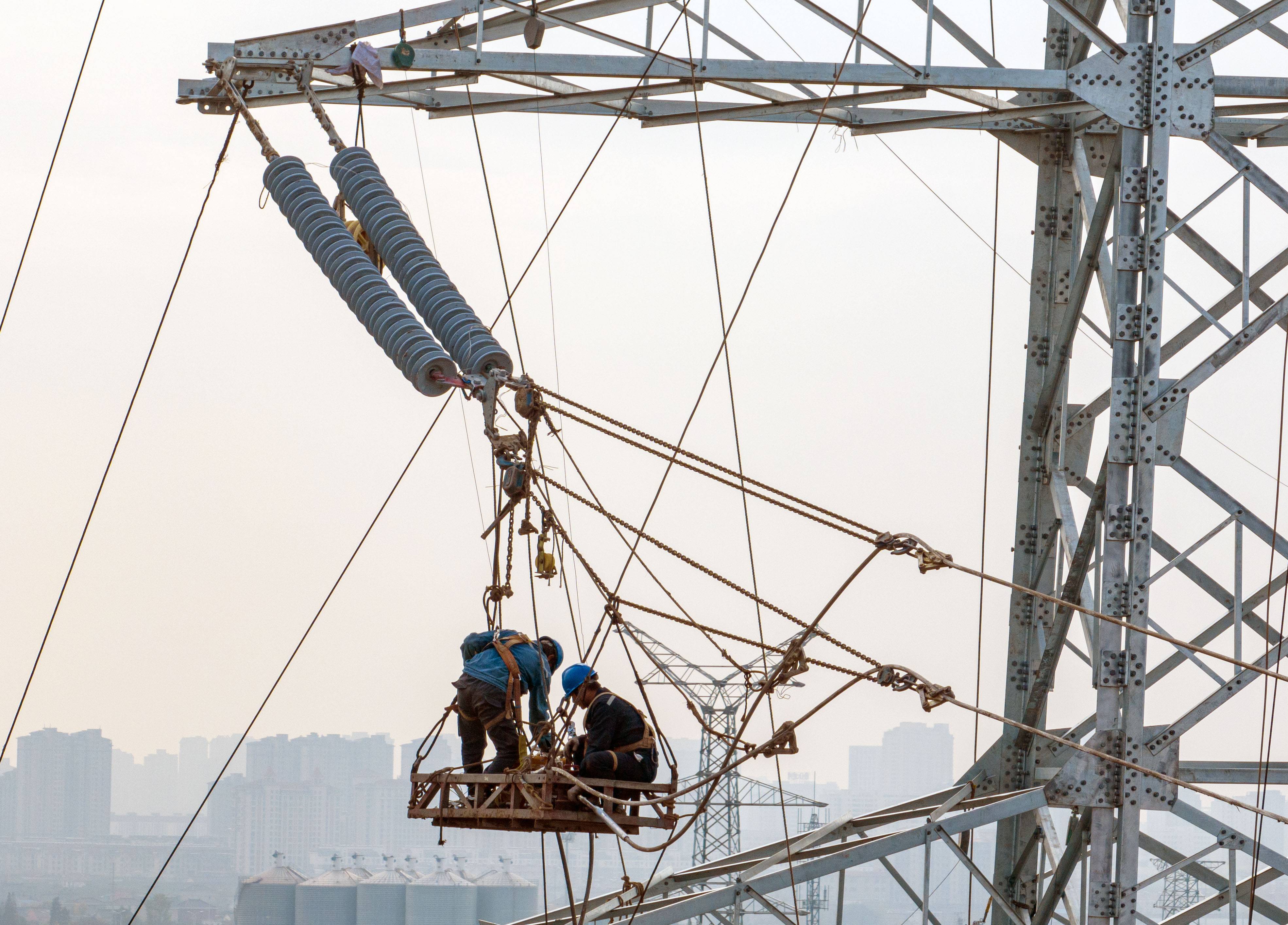 2022年11月25日,电力工人在江苏省泰州市姜堰区娄庄镇对新建220千伏白杨变电站配套出线工程跨越宁启铁路进行高空紧线作业。
