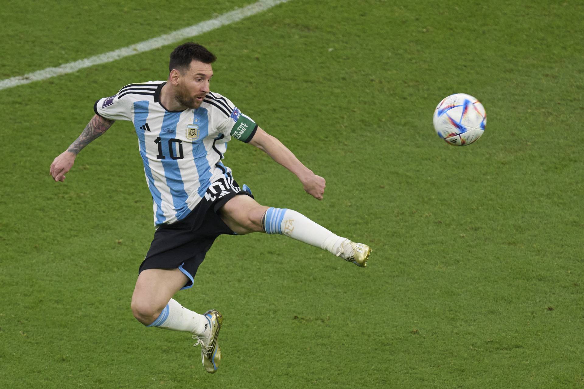 阿根廷队球员梅西在比赛中控球。
