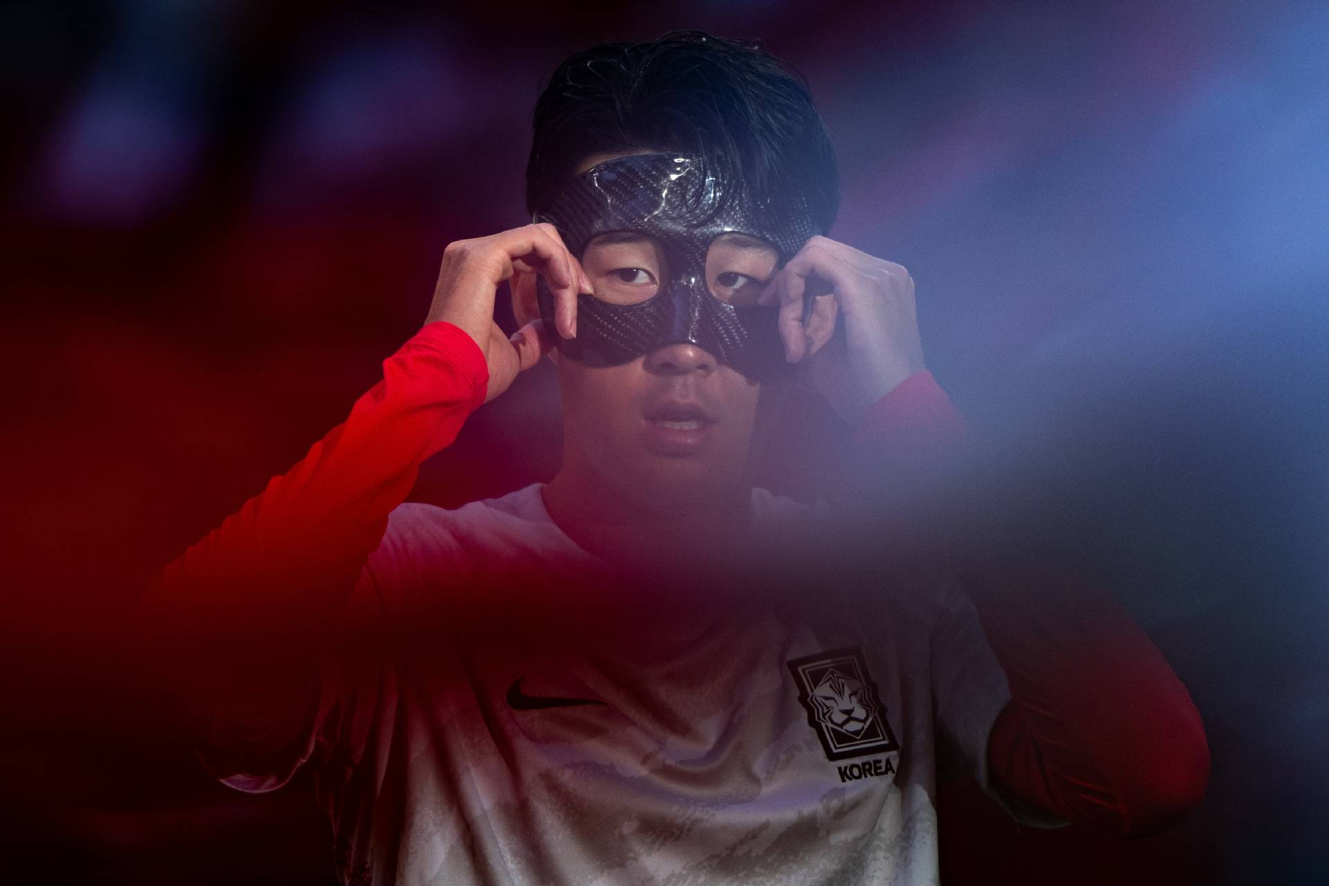 韩国队球员孙兴民赛前热身。