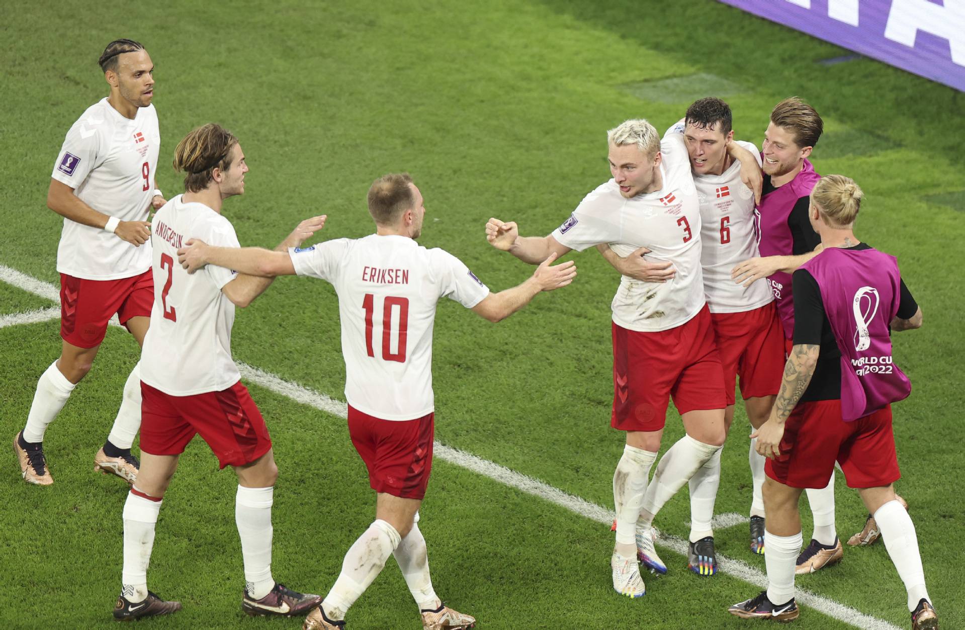 丹麦队球员克里斯滕森(右三)在比赛中进球后与队友庆祝。