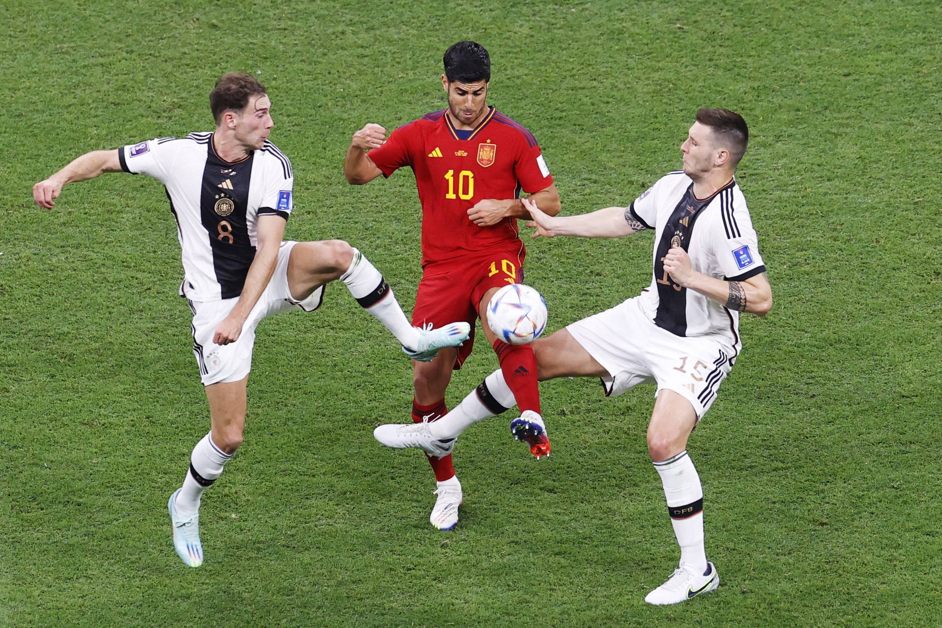 德国队球员格雷茨卡(左)和聚勒(右)夹击西班牙队球员阿森西奥。