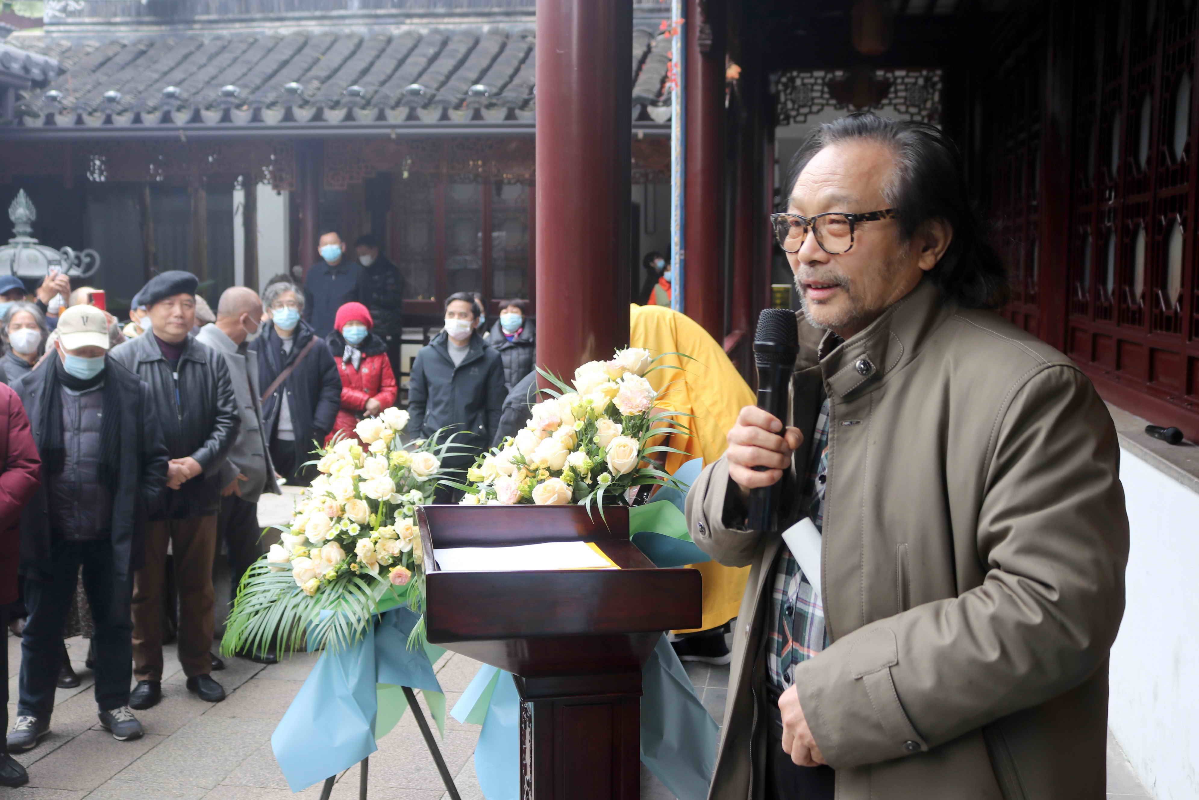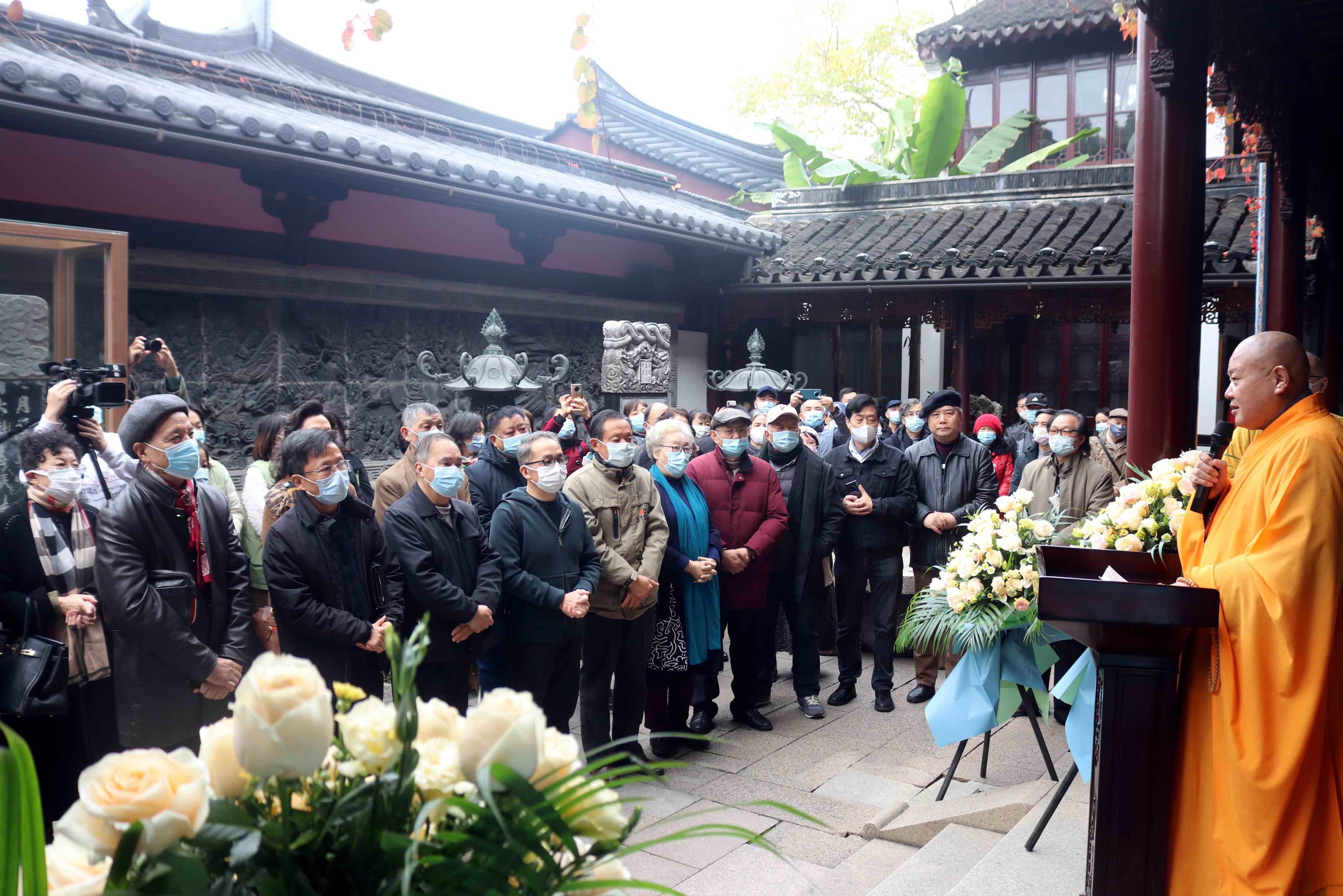 出席开幕式的有寒山寺方丈秋爽大和尚,中国文物学会专家委员会委员丹青,国家文物鉴宝委员会委员杨震华,有“南王北濮”之称的鉴宝专家濮安国,苏州博物馆原馆长钱公麟,以及宗教界、文化界、收藏界的领导、专家近百人。在开幕式上,苏州寒山寺秋爽法师致欢迎词,苏州收藏家协会副会长纪建平先生,苏州徐悲鸿艺术馆艺术总监戚品贤先生先后作了发言。欢迎各界人士的莅临指导,共同见证这一神圣的时刻。