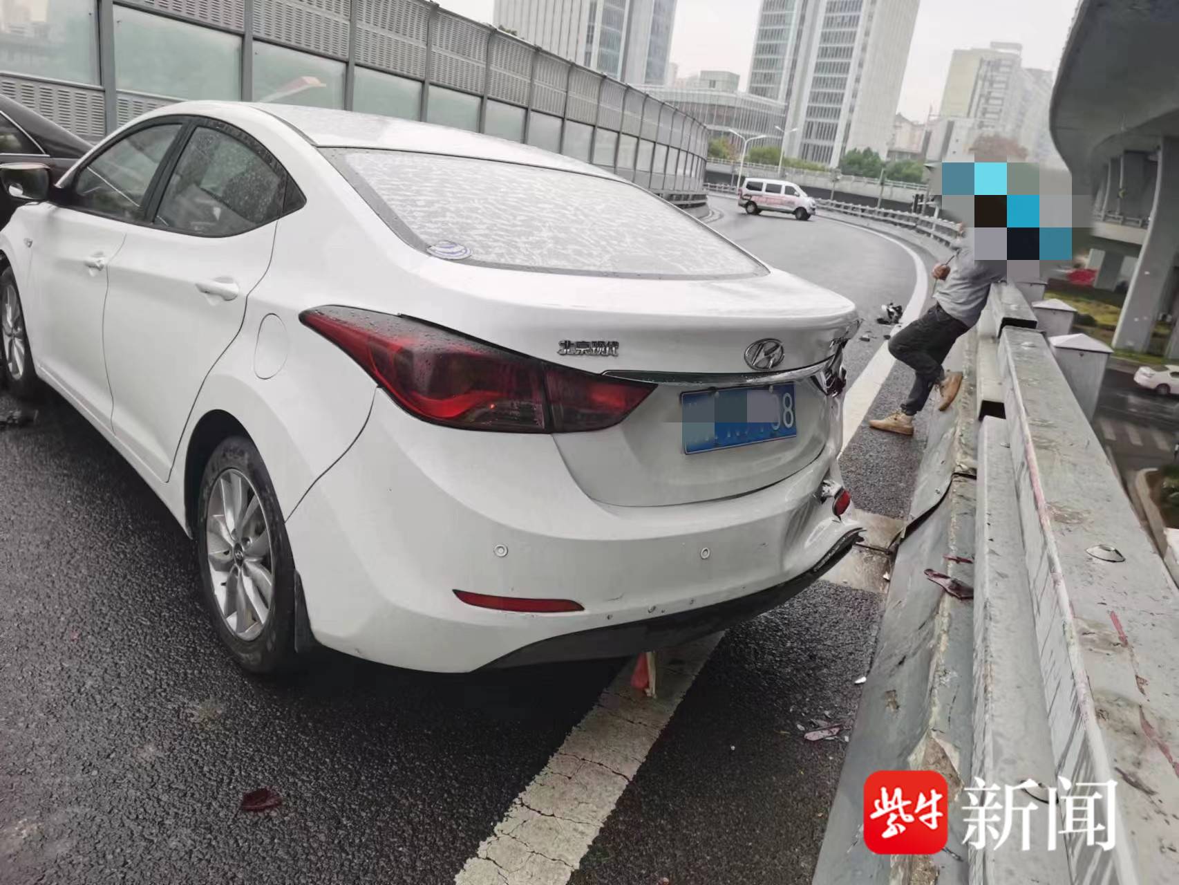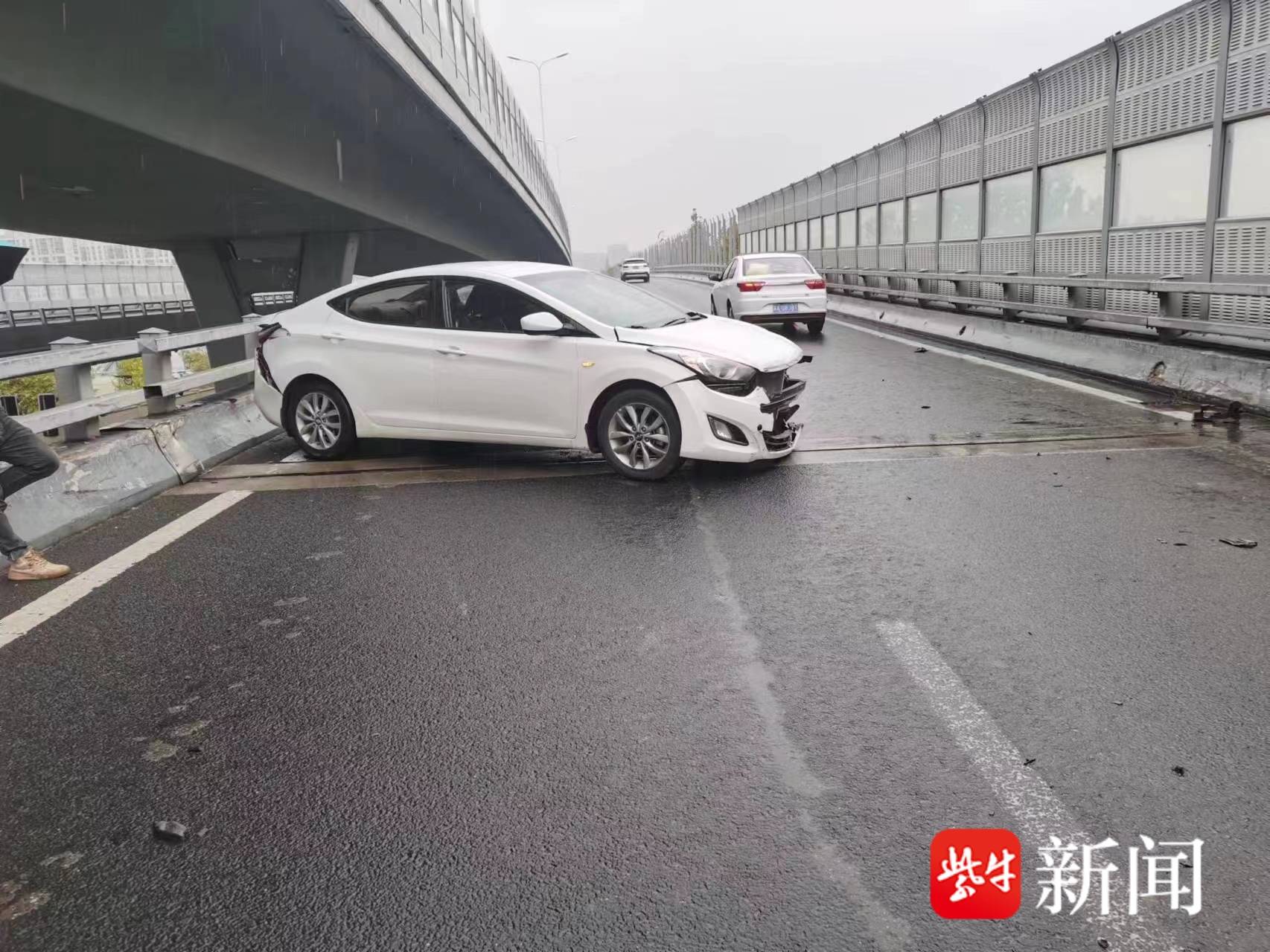 接到报警后,南站交警中队的民警立即赶到现场,发现一辆小轿车的车头、车尾均受损,打着双闪停在高架上桥口拐弯处,还占据了一股车道,车身旁部分护栏损坏严重。